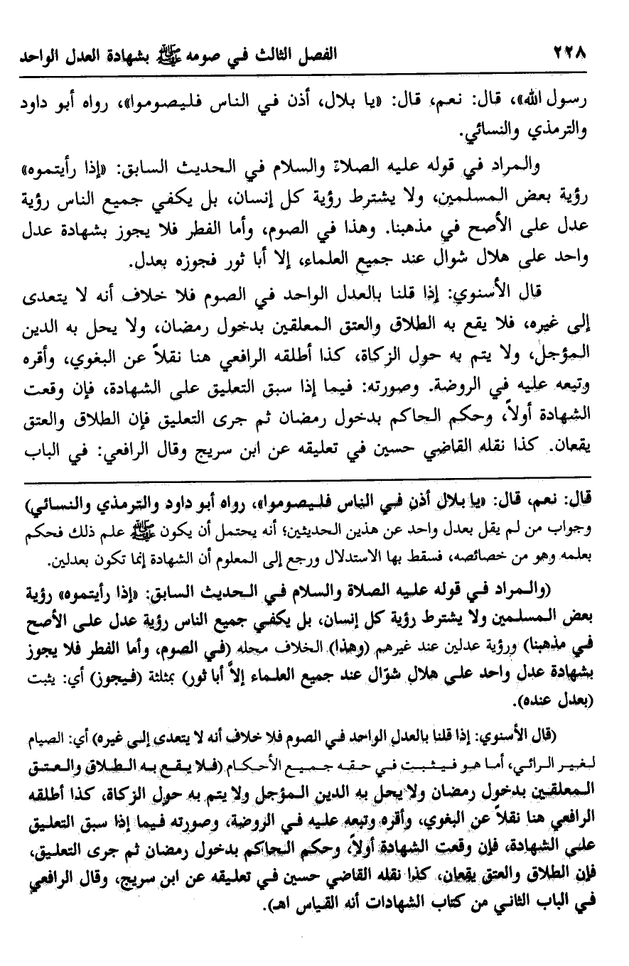 قال: نعم، قال: "يا بلال أذن في الناس فليصوموا"، رواه أبو داود والترمذي والنسائي" وجواب من لم يقل بعدل واحد عن هذين الحديثين؛ أنه يحتمل أن يكون -صلى الله عليه وسلم- علم ذلك فحكم بعلمه وهو من خصائصه، فسقط بها الاستدلال ورجع إلى المعلوم أن الشهادة إنما تكون بعدلين.
