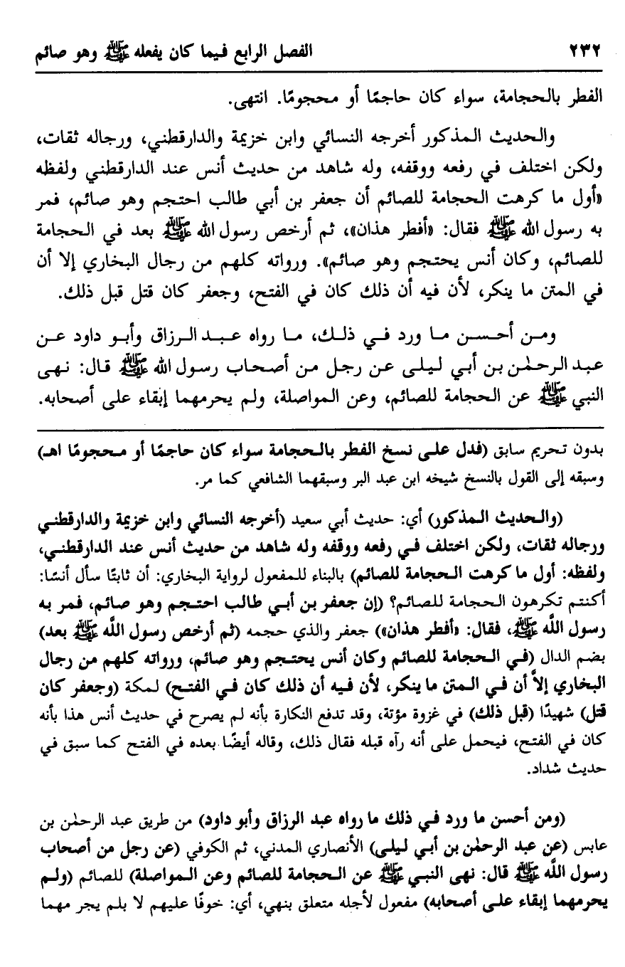 ومن أحسن ما ورد في ذلك، ما رواه عبد الرزاق وأبو داود عن عبد الرحمن بن أبي ليلى عن رجل من أصحاب رسول الله -صلى الله عليه وسلم- قال: نهى النبي -صلى الله عليه وسلم- عن الحجامة للصائم، وعن المواصلة، ولم يحرمهما إبقاء على أصحابه.