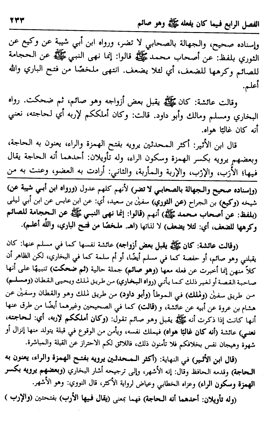 وقالت عائشة: كان -صلى الله عليه وسلم- يقبل بعض أزواجه وهو صائم، ثم ضحكت. رواه البخاري ومسلم ومالك وأبو داود. قالت: وكان أملككم لإربه أي لحاجته، نعني أنه كان غالبا هواه.