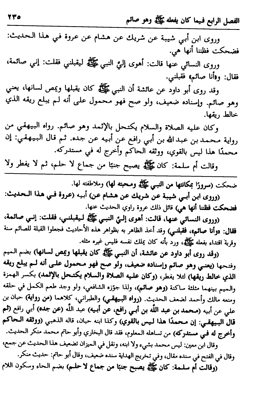 وكان عليه الصلاة والسلام يكتحل بالإثمد وهو صائم. رواه البيهقي من رواية محمد بن عبد الله بن أبي رافع عن أبيه عن جده. ثم قال البيهقي: إن محمدا هذا ليس بالقوي، ووثقه الحاكم وأخرج له في مستدركه.