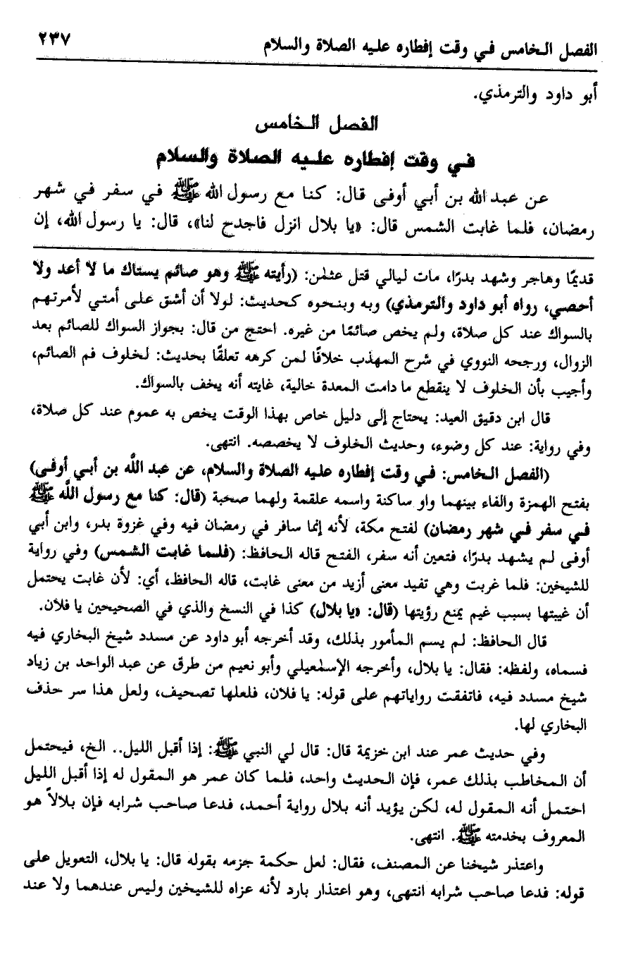 "الفصل الخامس: في وقت إفطاره عليه الصلاة والسلام، عن عبد الله بن أبي أوفى" بفتح الهمزة والفاء بينهما واو ساكنة واسمه علقمة ولهما صحبة "قال: كنا مع رسول الله -صلى الله عليه وسلم- في سفر في شهر رمضان" لفتح مكة؛ لأنه إنما سافر في رمضان فيه وفي غزوة بدر، وابن أبي أوفى لم يشهد بدرًا، فتعين أنه سفر، الفتح قاله الحافظ: "فلما غابت الشمس" وفي رواية للشيخين: فلما غربت وهي تفيد معنى أزيد من معنى غابت، قاله الحافظ، أي: لأن غابت يحتمل أن غيبتها بسبب غيم يمنع رؤيتها "قال: "يا بلال" كذا في النسخ والذي في الصيحين: "يا فلان".