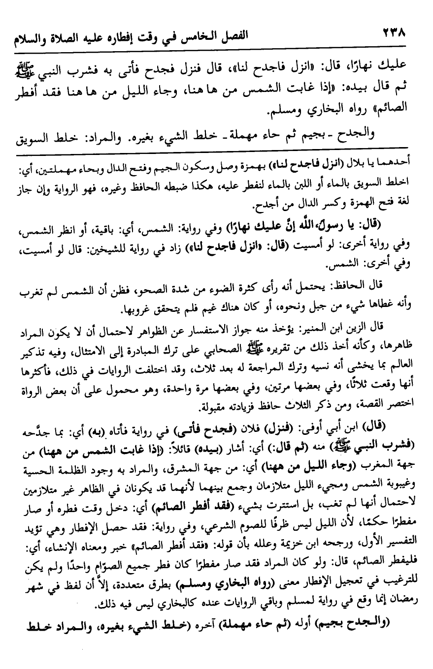 أحدهما "يا بلال" "انزل فاجدح لنا" بهمزة وصل وسكون الجيم وفتح الدال وبحاء مهملتين، أي: اخلط السويق بالماء أو اللبن بالماء لنفطر عليه، هكذا ضبطه الحافظ وغيره، فهو الرواية وإن جاز لغة فتح الهمزة وكسر الدال من أجدح.