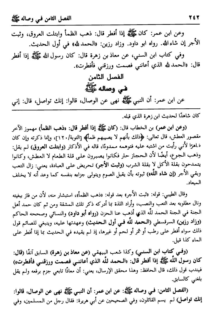 وعن ابن عمر: كان -صلى الله عليه وسلم- إذا أفطر قال: "ذهب الطمأ وابتلت العروق، وثبت الأجر إن شاء الله". رواه أبو داود. وزاد رزين: "الحمد لله" في أول الحديث.