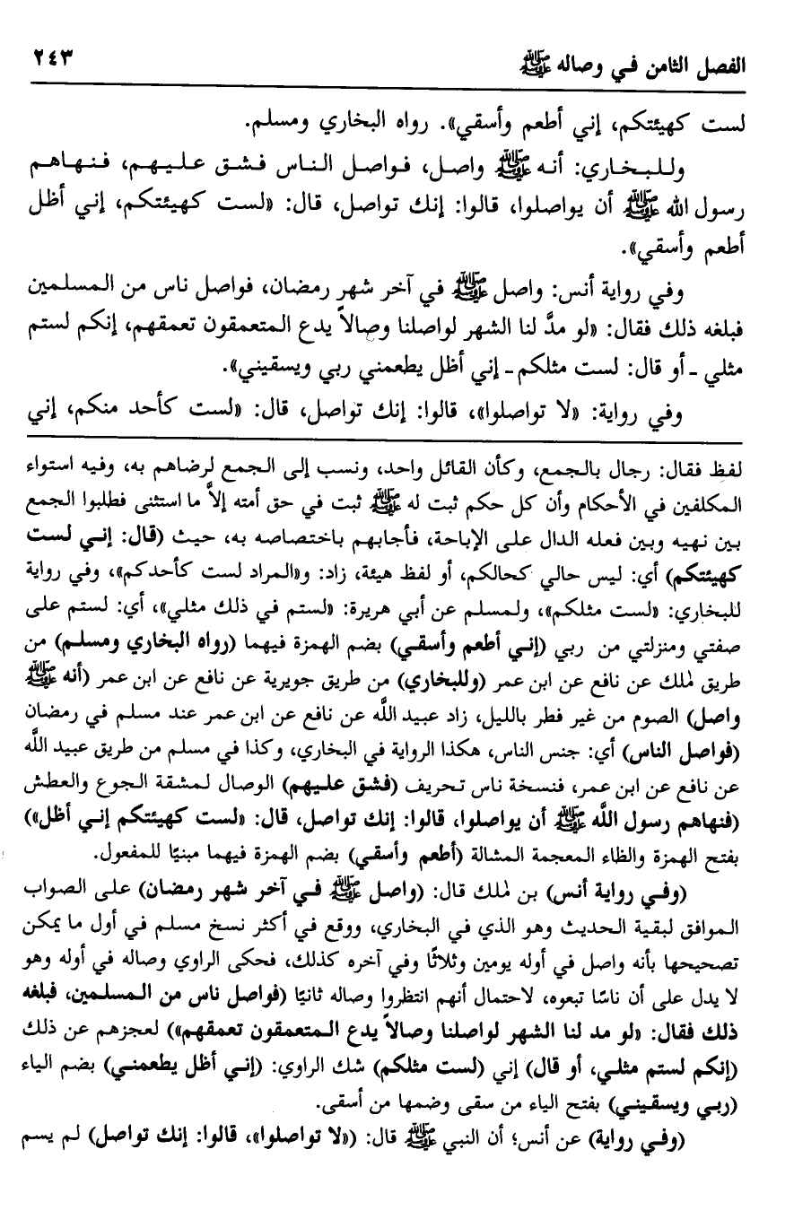 وفي رواية: "لا تواصلوا"، قالوا: إنك تواصل، قال: "لست كأحد منكم، إني