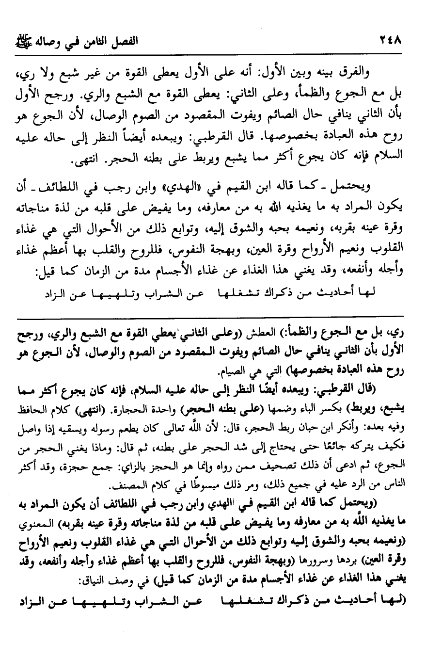 "قال القرطبي: ويبعده أيضا النظر إلى حاله عليه السلام، فإنه كان يجوع أكثر مما يشبع، ويربط" بكسر الباء وضمها "على بطنه الحجر" واحدة الحجارة. "انتهى" كلام الحافظ وفيه بعده: وأنكر ابن حبان ربط الحجر، قال: لأن الله تعالى كان يطعم رسوله ويسقيه إذا واصل فكيف يتركه جائعا حتى يحتاج إلى شد الحجر على بطنه، ثم قال: وماذا يغني الحجر من الجوع، ثم ادعى أن ذلك تصحيف ممن رواه وإنما هو الحجز بالزاي: جمع حجزة، وقد أكثر الناس من الرد عليه في جميع ذلك، ومر ذلك مبسوطا في كلام المصنف.