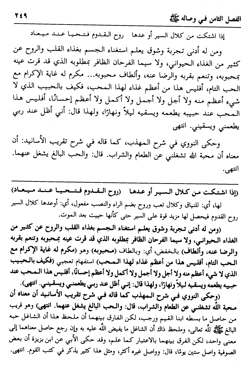 "ومن له أدنى تجربة وشوق يعلم استغناء الجسم بغذاء القلب والروح من كثير من الغذاء الحيواني، ولا سيما الفرحان الظافر بمطلوبه الذي قد قرت عينه بمحبوبه وتنعم بقربه والرضا عنه، وألطاف" بالخفض، أي: وبألطاف "محبوبه" وهو "مكرم له غاية الإكرام مع الحب التام، أفليس هذا من أعظم غذاء لهذا المحب" استفهام تعجبي "فكيف بالحبيب الذي ل شيء أعظم منه ولا أجل ولا أجمل ولا أكل ولا أعظم إحسانا، أفليس هذا المحب عند حبيبه يطعمه ويسقيه ليلا ونهارا، ولهذا قال: "إني أظل عند ربي يطعمني ويسقيني". انتهى".