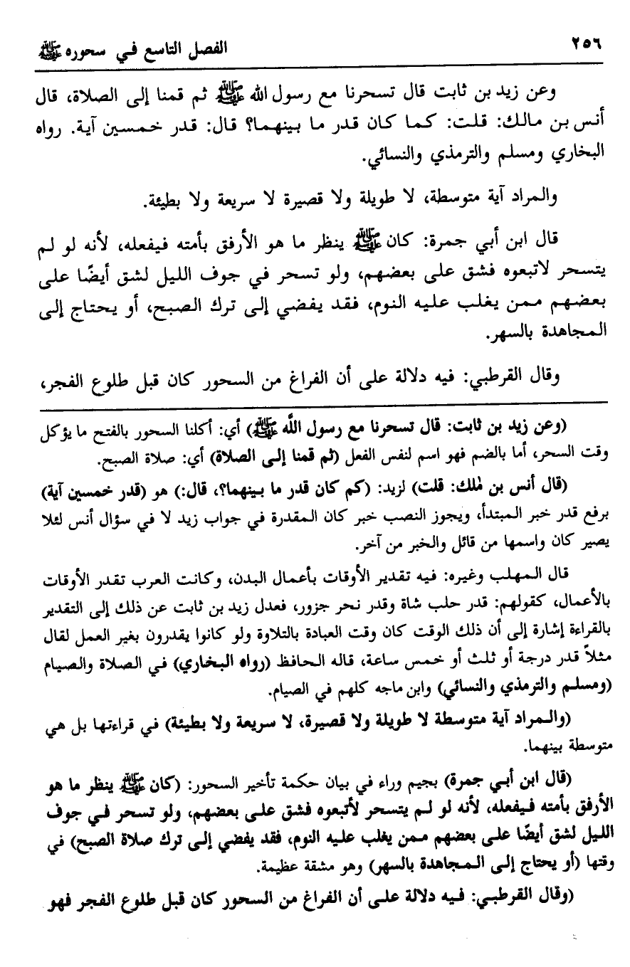 وعن زيد بن ثابت قال: تسحرنا مع رسول الله -صلى الله عليه وسلم- ثم قمنا إلى الصلاة، قال أنس بن مالك: قلت: كما كان قدر ما بينهما؟ قال: قدر خمسين آية. رواه البخاري ومسلم والترمذي والنسائي.