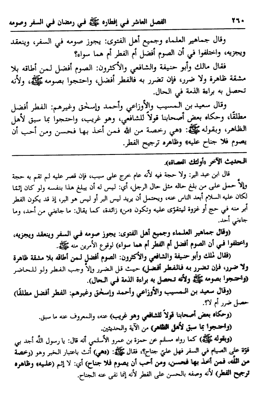 "فقال مالك وأبو حنيفة والشافعي والأكثرون: الصوم أفضل لمن أطاقه بلا مشقة ظاهرة ولا ضرر، فإن تضرر به فالفطر أفضل" حيث قل الضرر وإلا وجب الفطر ولو للحاضر "واحتجوا بصومه -صلى الله عليه وسلم-؛ ولأنه تحصل به براءة الذمة في الحال".