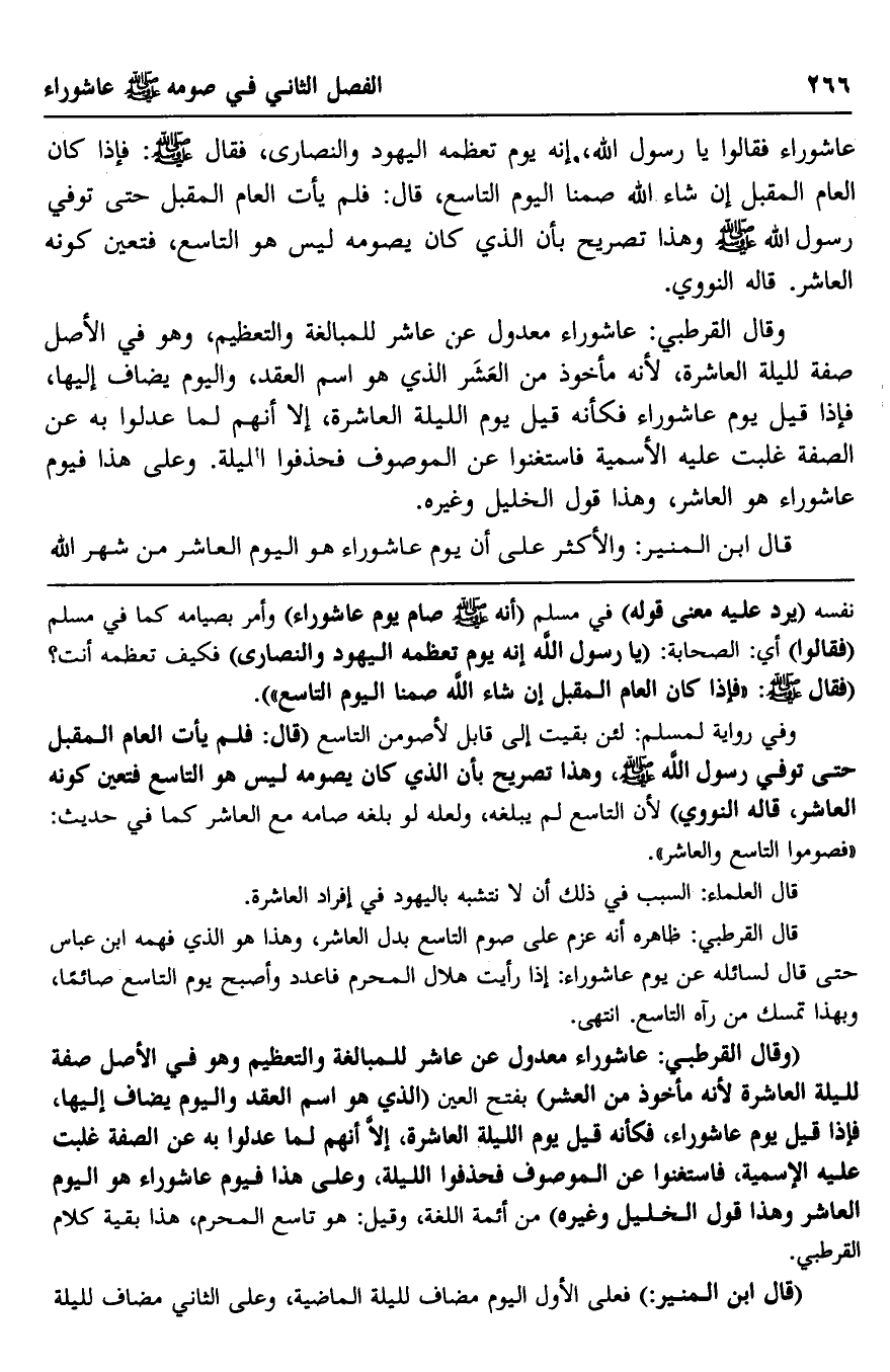 عاشوراء فقالوا: يا رسول الله، إنه يوم تعظمه اليهود والنصارى، فقال -صلى الله عليه وسلم: فإذا كان العام المقبل إن شاء الله صمنا اليوم التاسع، قال: فلم يأت العام المقبل حتى توفي رسول الله -صلى الله عليه وسلم- وهذا تصريح بأن الذي كان يصومه ليس هو التاسع، فتعين كونه العاشر. قاله النووي.