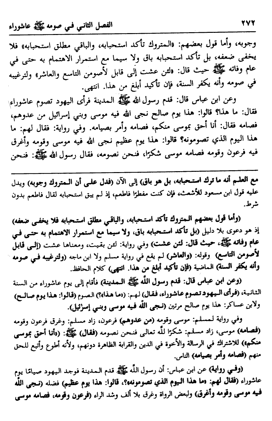وعن ابن عباس قال: قدم رسول الله -صلى الله عليه وسلم- المدينة فرأى اليهود تصوم عاشوراء فقال: "ما هذا"؟ قالوا: هذا يوم صالح نجى الله فيه موسى وبني إسرائيل من عدوهم، فصامه فقال: "أنا أحق بموسى منكم"، فصامه وأمر بصيامه. وفي رواية: فقال لهم: "ما هذا اليوم الذي تصومونه"؟ قالوا: هذا يوم عظيم نجى الله فيه موسى وقومه وأغرق فيه فرعون وقومه فصامه موسى شكرا، فنحن نصومه، فقال رسول الله -صلى الله عليه وسلم: "فنحن