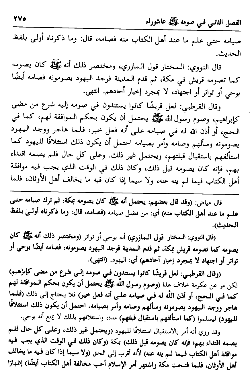 وقال القرطبي: لعل قريشا كانوا يستندون في صومه إليه شرع من مضى كإبراهيم، وصوم رسول الله -صلى الله عليه وسلم- يحتمل أن يكون بحكم الموافقة لهم، كما في الحج، أو أذن الله له في صيامه على أنه فعل خير، فلما هاجر ووجد اليهود يصومونه وسألهم وصامه أمر بصيامه احتمل أن يكون ذلك استئلافا للهيود كما استألفهم باستقبال قبلتهم، ويحتمل غير ذلك. وعلى كل حال فلم يصمه اقتداء بهم، فإنه كان يصومه قبل ذلك، وكان ذلك في الوقت الذي يجب فيه موافقة أهل الكتاب فيما لم ينه عنه، ولا سيما إذا كان فيه ما يخالف أهل الأوثان، فلما