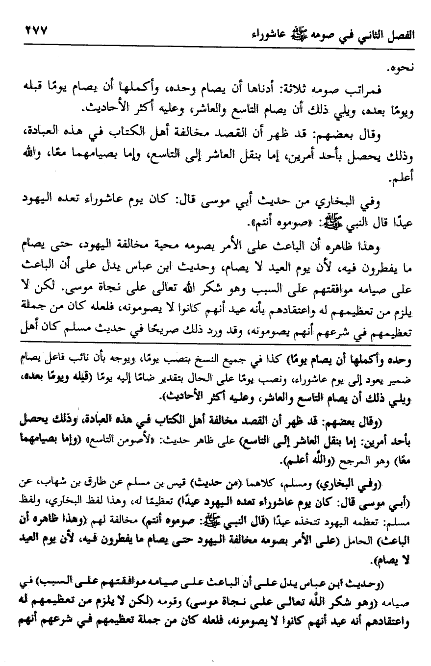 "وقال بعضهم: قد ظهر أن القصد مخالفة أهل الكتاب في هذه العبادة، وذلك يحصل بأحد أمرين: إما بنقل العاشر إلى التاسع" على ظاهر حديث: "لأصومن التاسع" "وإما بصيامهما معا" وهو المرجح. "والله أعلم".