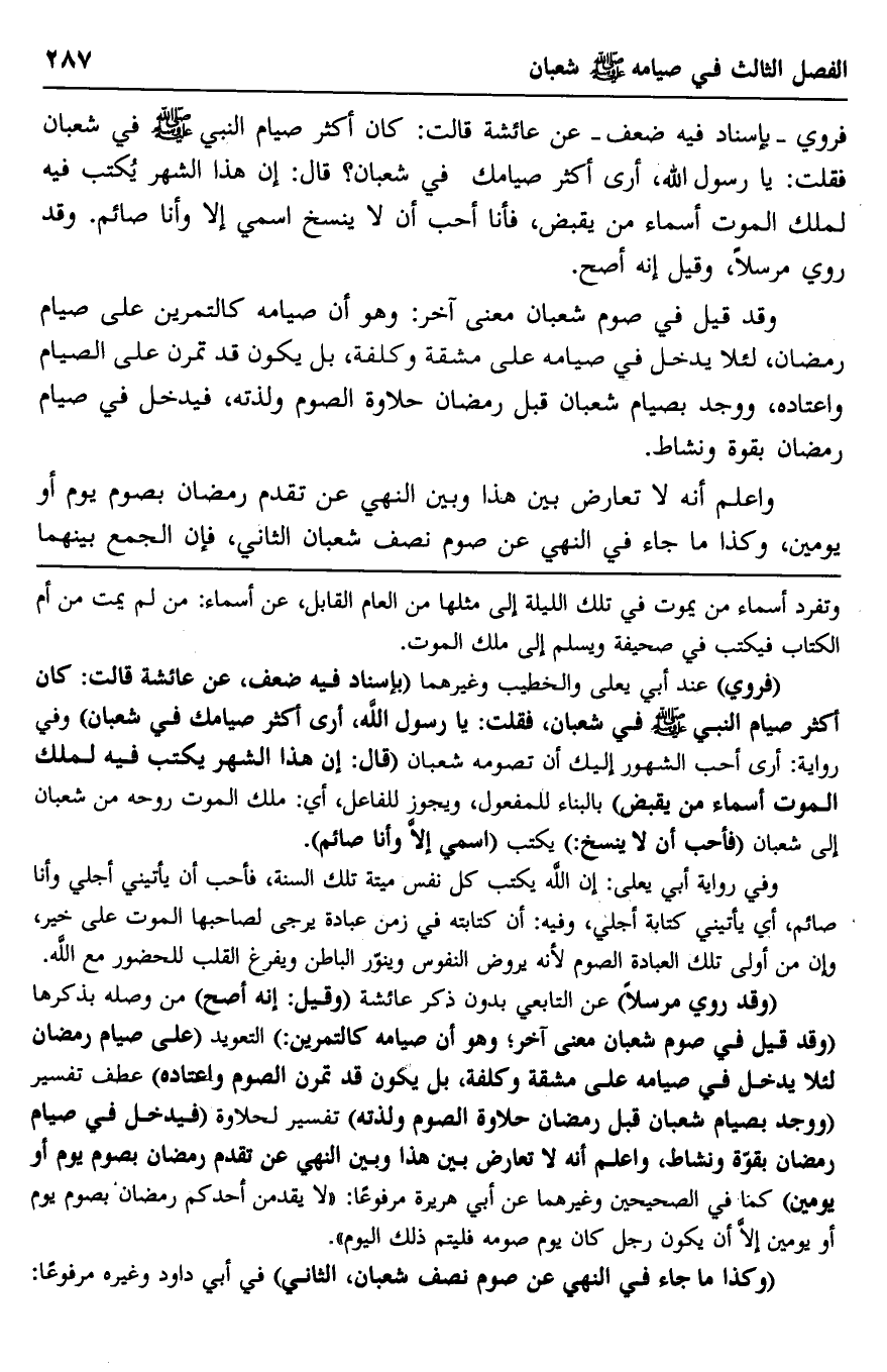 فروي -بإسناد فيه ضعف- عن عائشة قالت: كان أكثر صيام النبي -صلى الله عليه وسلم- في شعبان فقلت: يا رسول الله، أرى أكثر صيامك في شعبان؟ قال: إن هذا الشهر يكتب فيه لملك الموت أسماء من يقبض، فأنا أحب أن لا ينسخ اسمي إلا وأنا صائم. وقد روي مرسلا، وقيل: إنه أصح.
