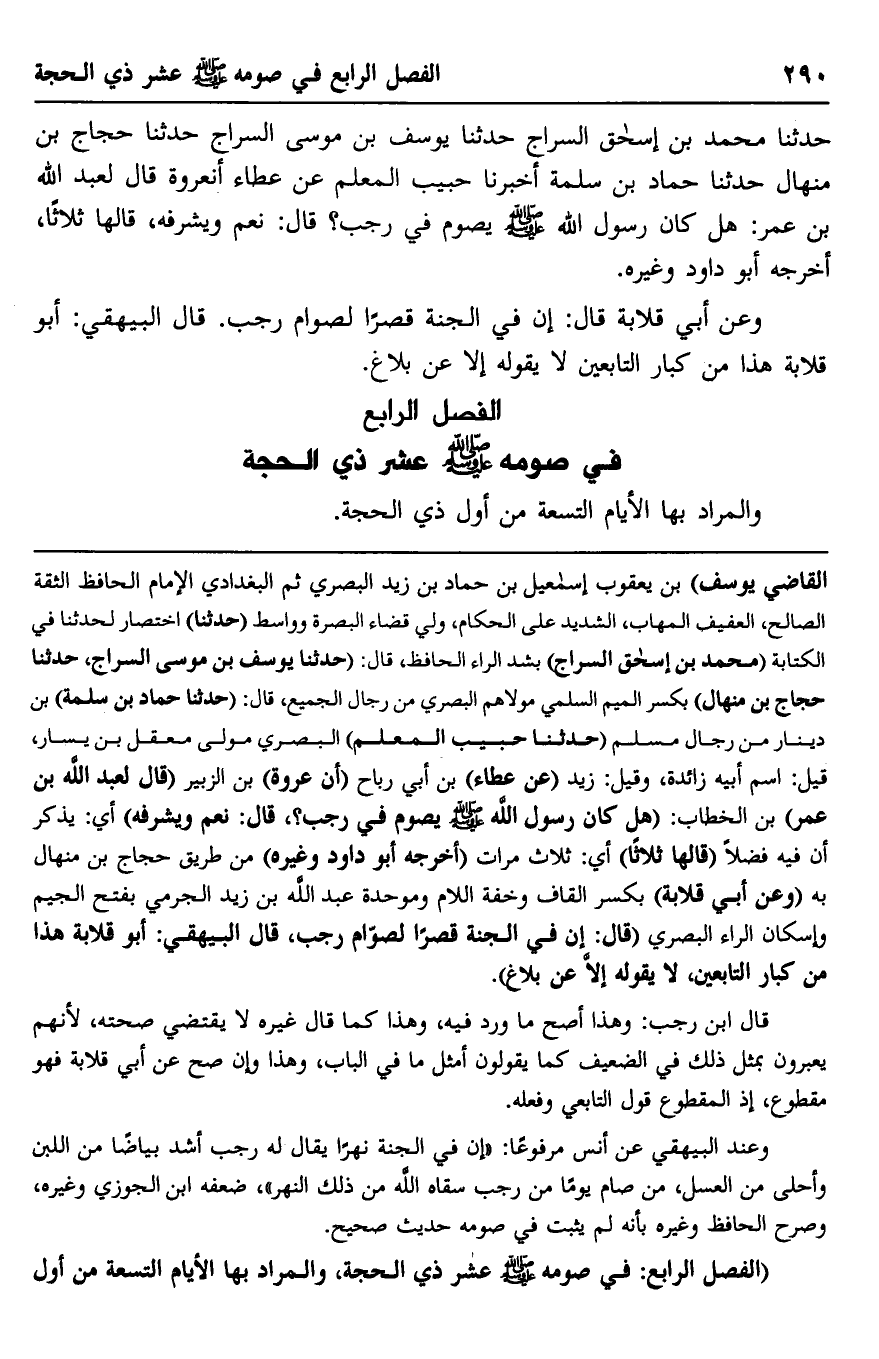 حدثنا محمد بن إسحاق السراج حدثنا يوسف بن موسى السراج حدثنا حجاج بن منهال حدثنا حماد بن سلمة أخبرنا حبيب المعلم عن عطاء أن عروة قال لعبد الله بن عمر: هل كان رسول الله -صلى الله عليه وسلم- يصوم في رجب؟ قال: نعم ويشرفه، قالها ثلاثا، أخرجه أبو داود وغيره.