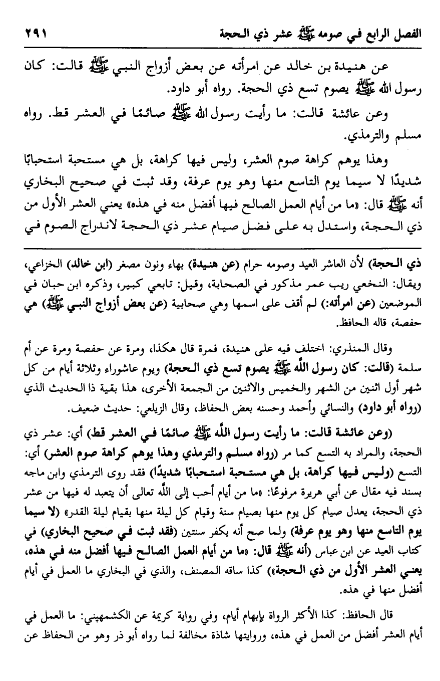 عن هنيدة بن خالد عن امرأته عن بعض أزواج النبي -صلى الله عليه وسلم- قالت: كان رسول الله -صلى الله عليه وسلم- يصوم تسع ذي الحجة. رواه أبو داود.