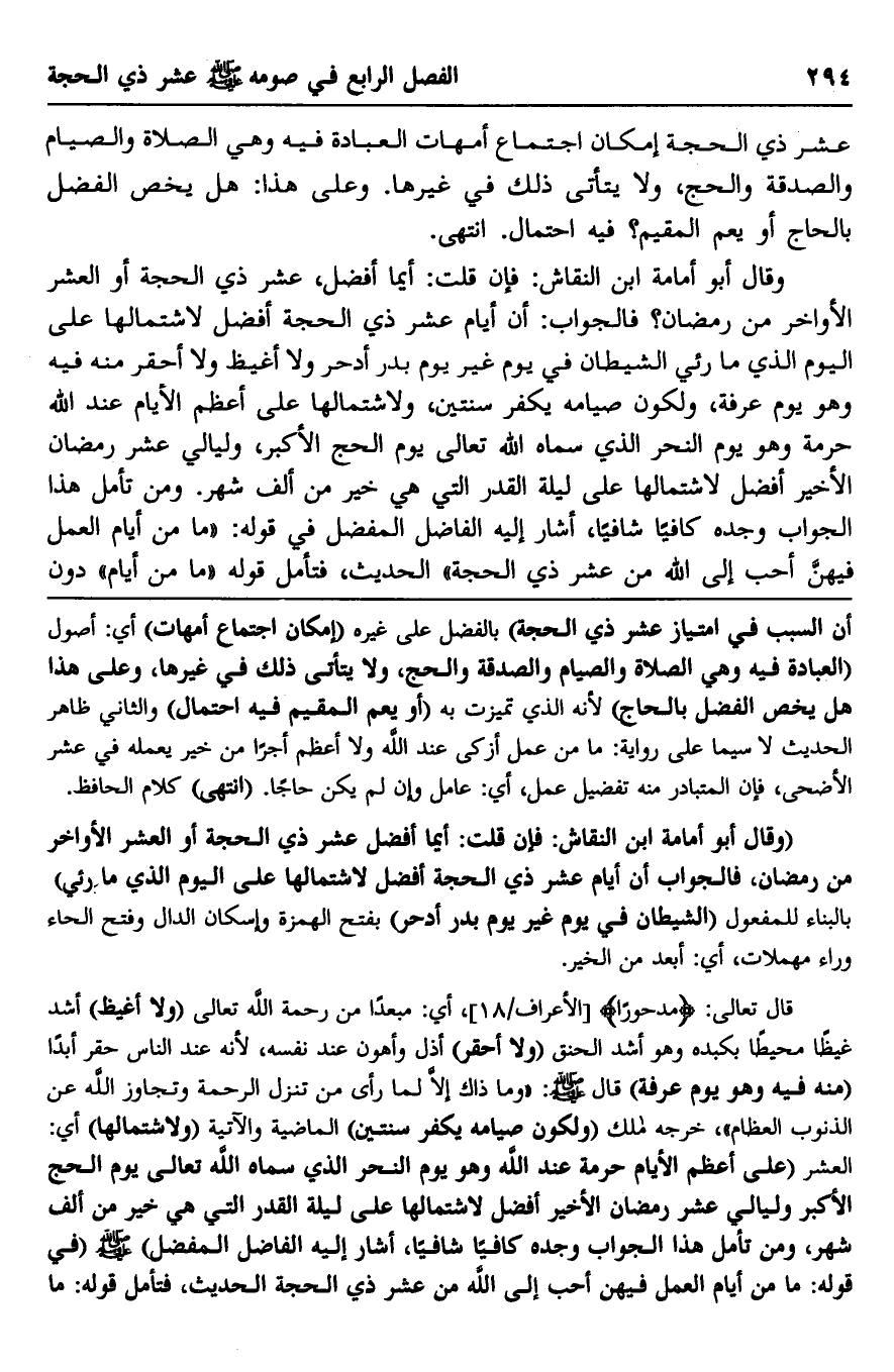 وقال أبو أمامة ابن النقاش: فإن قلت: أيما أفضل، عشر ذي الحجة أو العشر الأواخر من رمضان؟ فالجواب: أن أيام عشر ذي الحجة أفضل لاشتمالها على اليوم الذي ما رئي الشيطان في يوم غير يوم بدر أدحر ولا أغيظ ولا أحقر منه فيه، وهو يوم عرفة، ولكون صيامه يكفر سنتين، ولاشتمالها على أعظم الأيام عند الله حرمة وهو يوم النحر الذي سماه الله تعالى يوم الحج الأكبر، وليالي عشر رمضان الأخير أفضل لاشتمالها على ليلة القدر التي هي خير من ألف شهر، ومن تأمل هذا الجواب وجده كافيا شافيا، أشار إليه الفاضل المفضل في قوله: "ما من أيام العمل فيهن أحب إلى الله من عشر ذي الحجة" الحديث، فتأمل قوله: "ما من أيام" دون