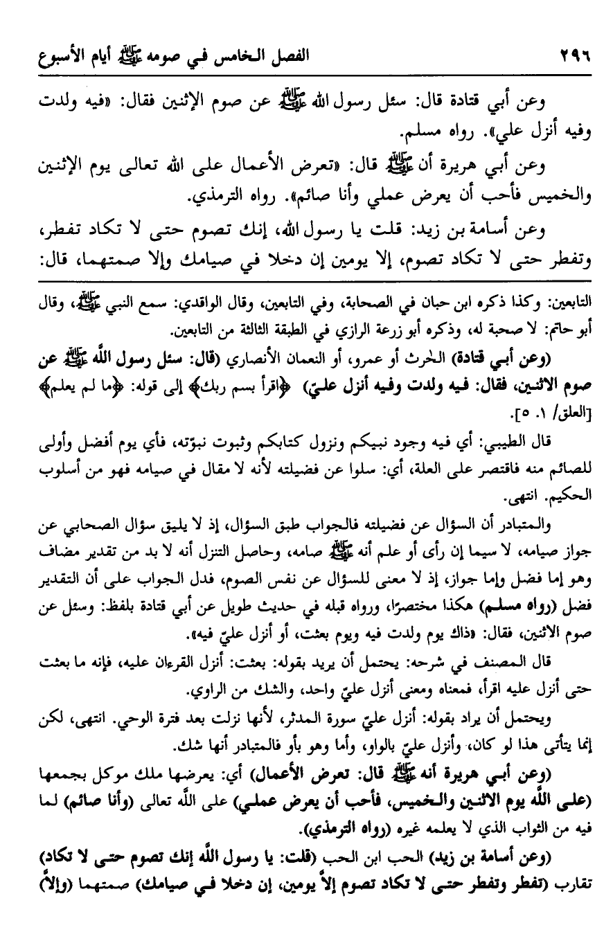 "وعن أبي قتادة" الحارث أو عمرو، أو النعمان الأنصاري "قال: سئل رسول الله -صلى الله عليه وسلم- عن صوم الاثنين، فقال: "فيه ولدت وفيه أنزل علي" {اقْرَأْ بِاسْمِ رَبِّكَ} إلى قوله: {مَا لَمْ يَعْلَمْ} [العلق: 1-5] ".