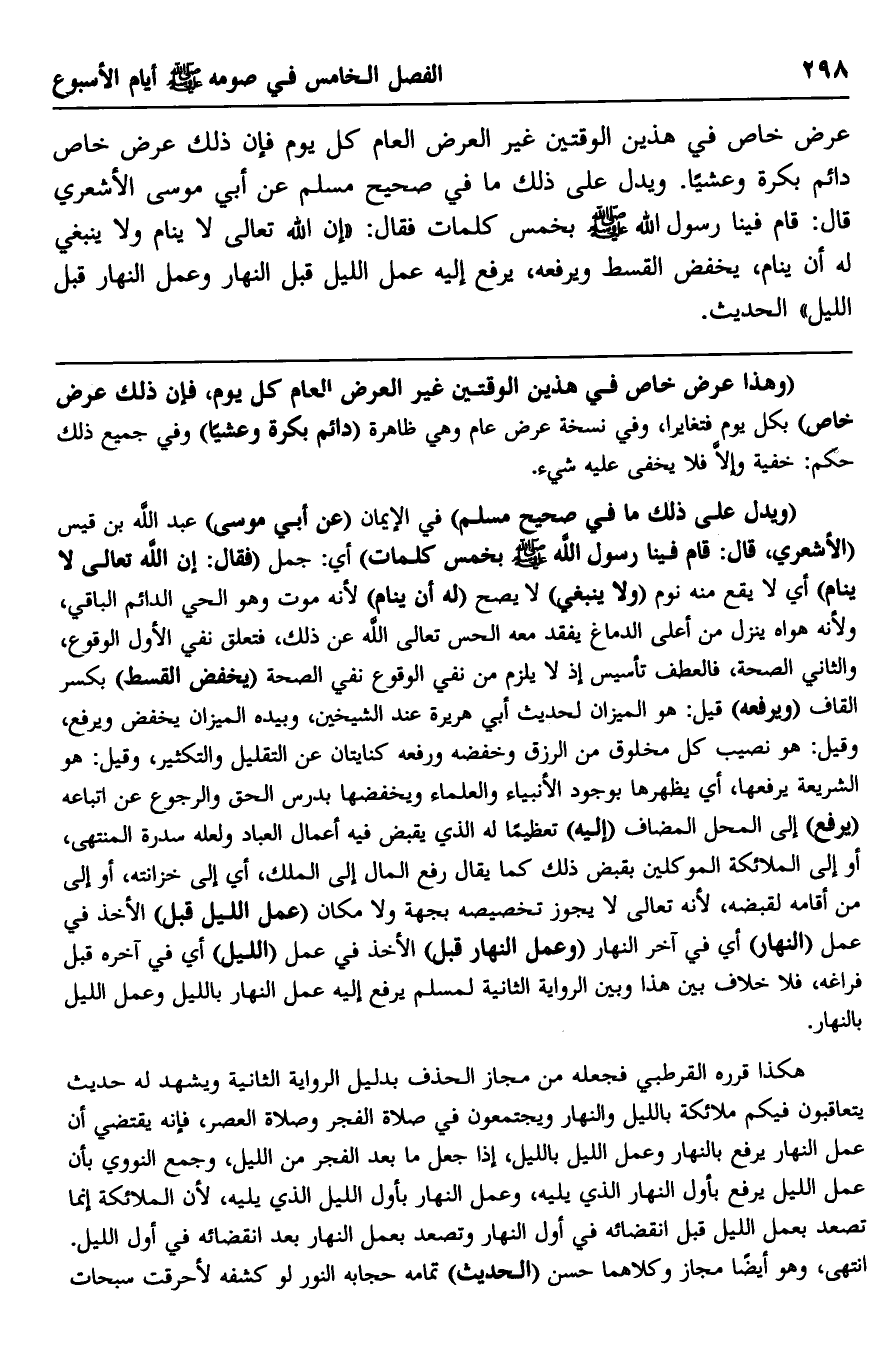 عرض خاص في هذين الوقتين غير العرض العام كل يوم، فإن ذلك عرض خاص دائم بكرة وعشيا. ويدل على ذلك ما في صحيح مسلم عن أبي موسى الأشعري قال: قام فينا رسول الله -صلى الله عليه وسلم- بخمس كلمات فقال: "إن الله تعالى لا ينام ولا ينبغي له أن ينام، يخفض القسط ويرفعه، يرفع إليه عمل الليل قبل النهار وعمل النهار قبل الليل" الحديث.