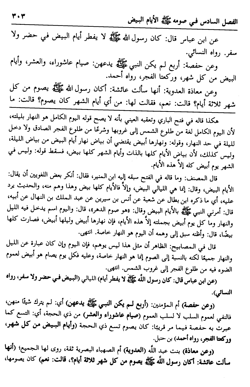 "عن ابن عباس قال: كان رسول الله -صلى الله عليه وسلم- لا يفطر أيام" الليالي "البيض في حضر ولا سفر، رواه النسائي".
