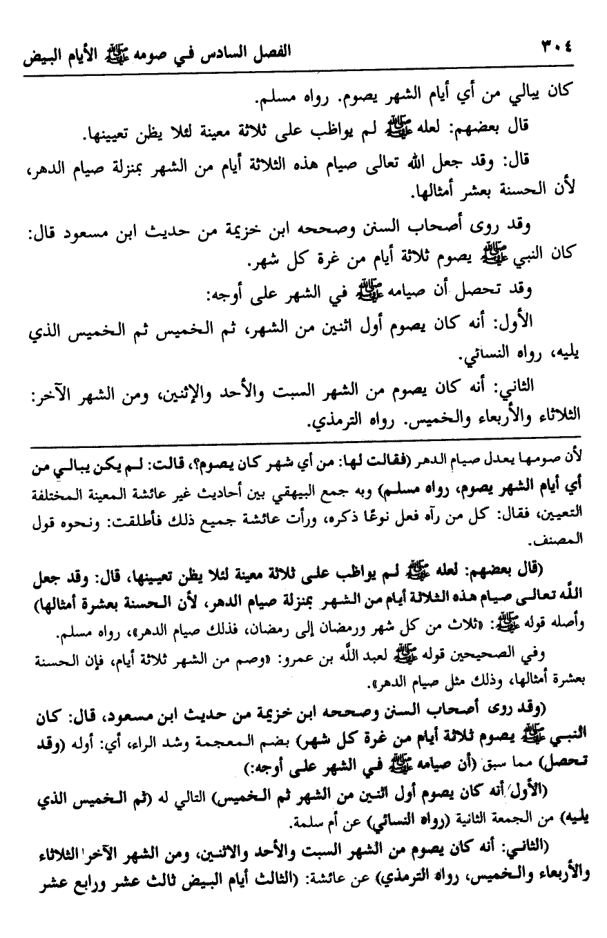 "الثاني: أنه كان يصوم من الشهر السبت والأحد والاثنين ومن الشهر الآخر الثلاثاء والأربعاء والخميس، رواه الترمذي" عن عائشة: "الثالث أيام البيض ثالث عشر ورابع عشر