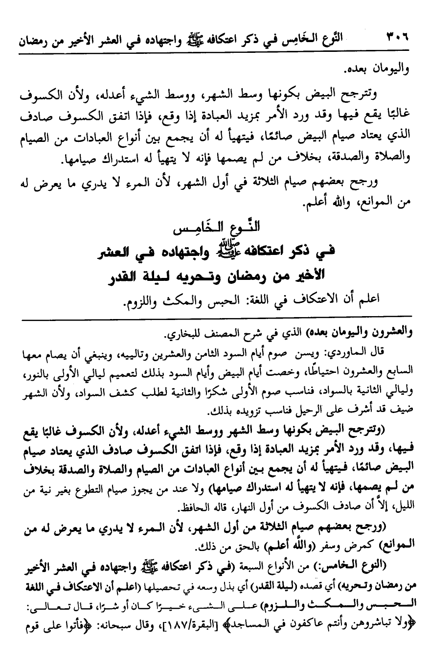 "النوع الخامس:" من الأنواع السبعة "في ذكر اعتكافه -صلى الله عليه وسلم- واجتهاده في العشر الأخير من رمضان وتحريه" أي قصده "ليلة القدر" أي بذل وسعه في تحصيلها "اعلم أن الاعتكاف في اللغة الحبس والمكث واللزوم" على الشيء خيرا كان أو شرا، قال تعالى: {وَلَا تُبَاشِرُوهُنَّ وَأَنْتُمْ عَاكِفُونَ فِي الْمَسَاجِدِ} [البقرة: 187] ، وقال سبحانه: {فَأَتَوْا عَلَى قَوْمٍ