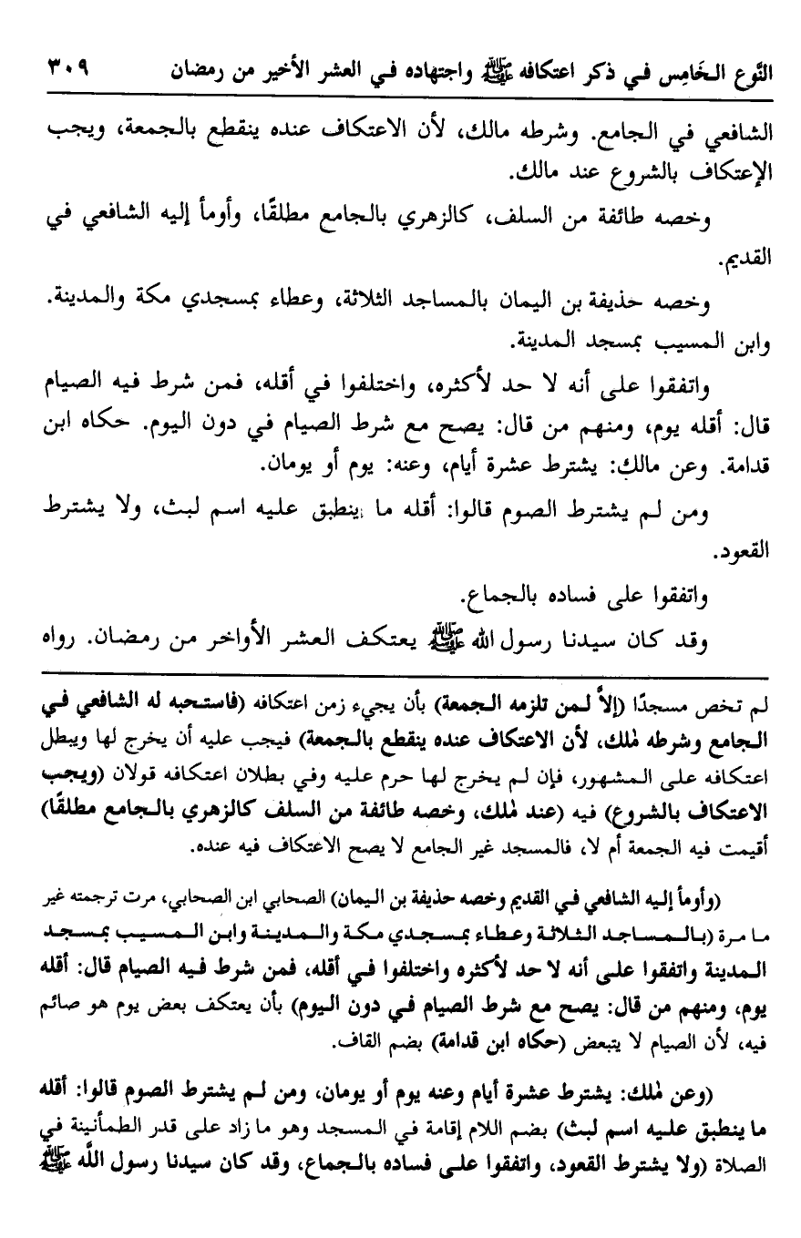 لم تخص مسجدا "إلا لمن تلزمه الجمعة" بأن يجيء زمن اعتكافه "فاستحبه له الشافعي في الجامع وشرطه مالك؛ لأن الاعتكاف عنده ينقطع بالجمعة" فيجب عليه أن يخرج لها ويبطل اعتكافه على المشهور، فإن لم يخرج لها حرم عليه وفي بطلان اعتكافه قولان "ويجب الاعتكاف بالشروع" فيه "عند مالك، وخصه طائفة من السلف كالزهري بالجامع مطلقًا" أقيمت فيه الجمعة أم لا، فالمسجد غير الجامع لا يصح الاعتكاف فيه عنده.