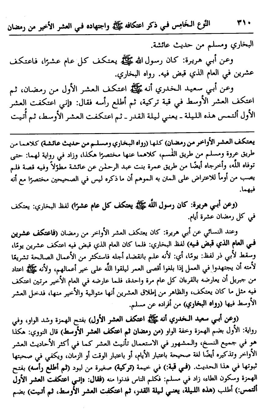وعن أبي سعيد الخدري أنه -صلى الله عليه وسلم- اعتكف العشر الأول من رمضان، ثم اعتكف العشر الأوسط في قبة تركية، ثم أطلع رأسه فقال: "إني اعتكفت العشر الأول ألتمس هذه الليلة -يعني ليلة القدر- ثم اعتكفت العشر الأوسط، ثم أتيت