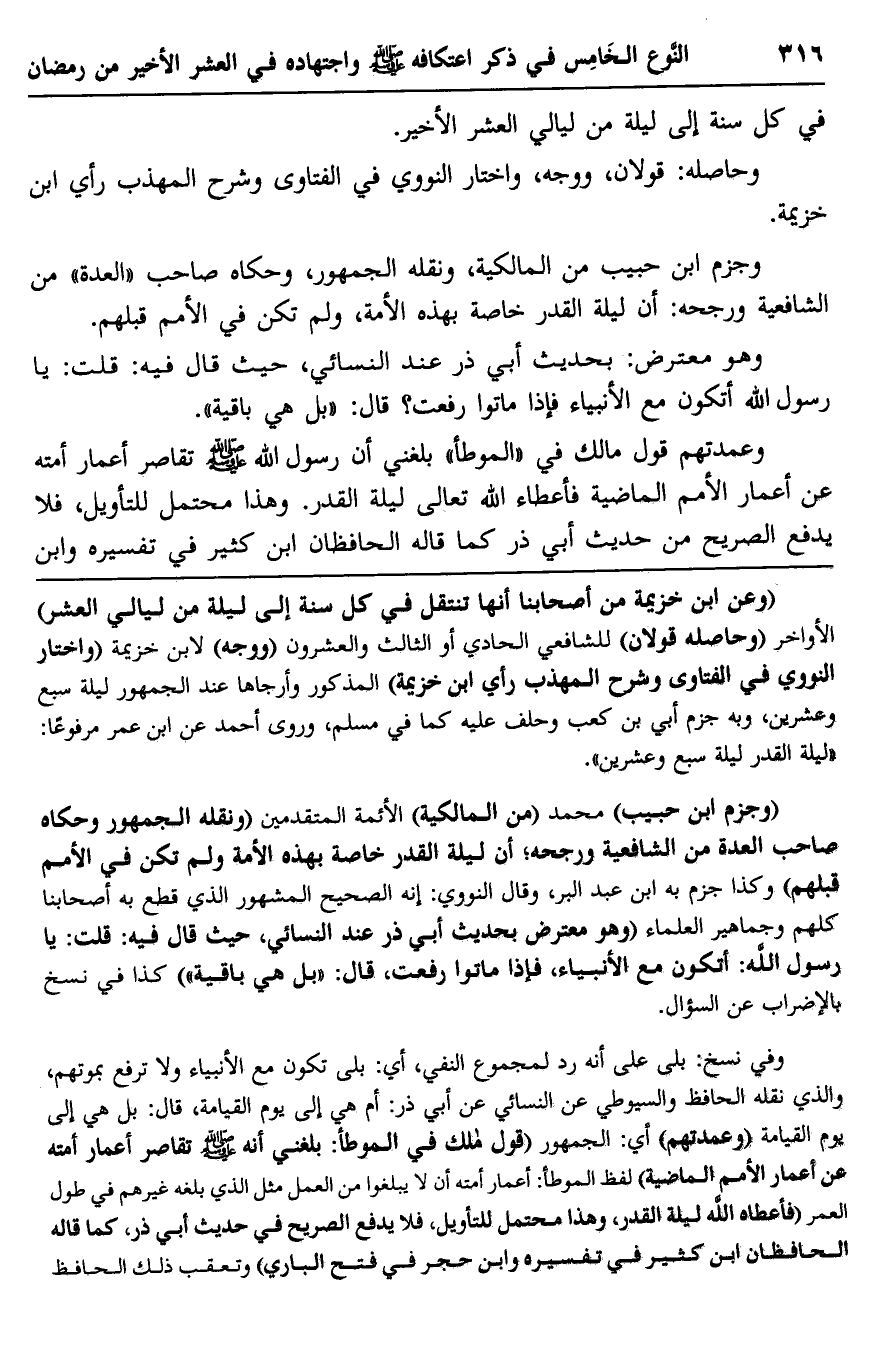 "وجزم ابن حبيب" محمد "من المالكية" الأئمة المتقدمين "ونقله الجمهور وحكاه صاحب العدة من الشافعية ورجحه؛ أن ليلة القدر خاصة بهذه الأمة ولم تكن في الأمم قبلهم" وكذا جزم به ابن عبد البر، وقال النووي: إنه الصحيح المشهور الذي قطع به أصحابنا كلهم وجماهير العلماء "وهو معترض بحديث أبي ذر عند النسائي، حيث قال فيه: قلت: يا رسول الله أتكون مع الأنبياء، فإذا ماتوا رفعت؟، قال: "بل هي باقية" كذا في نسخ بالإضراب عن السؤال.