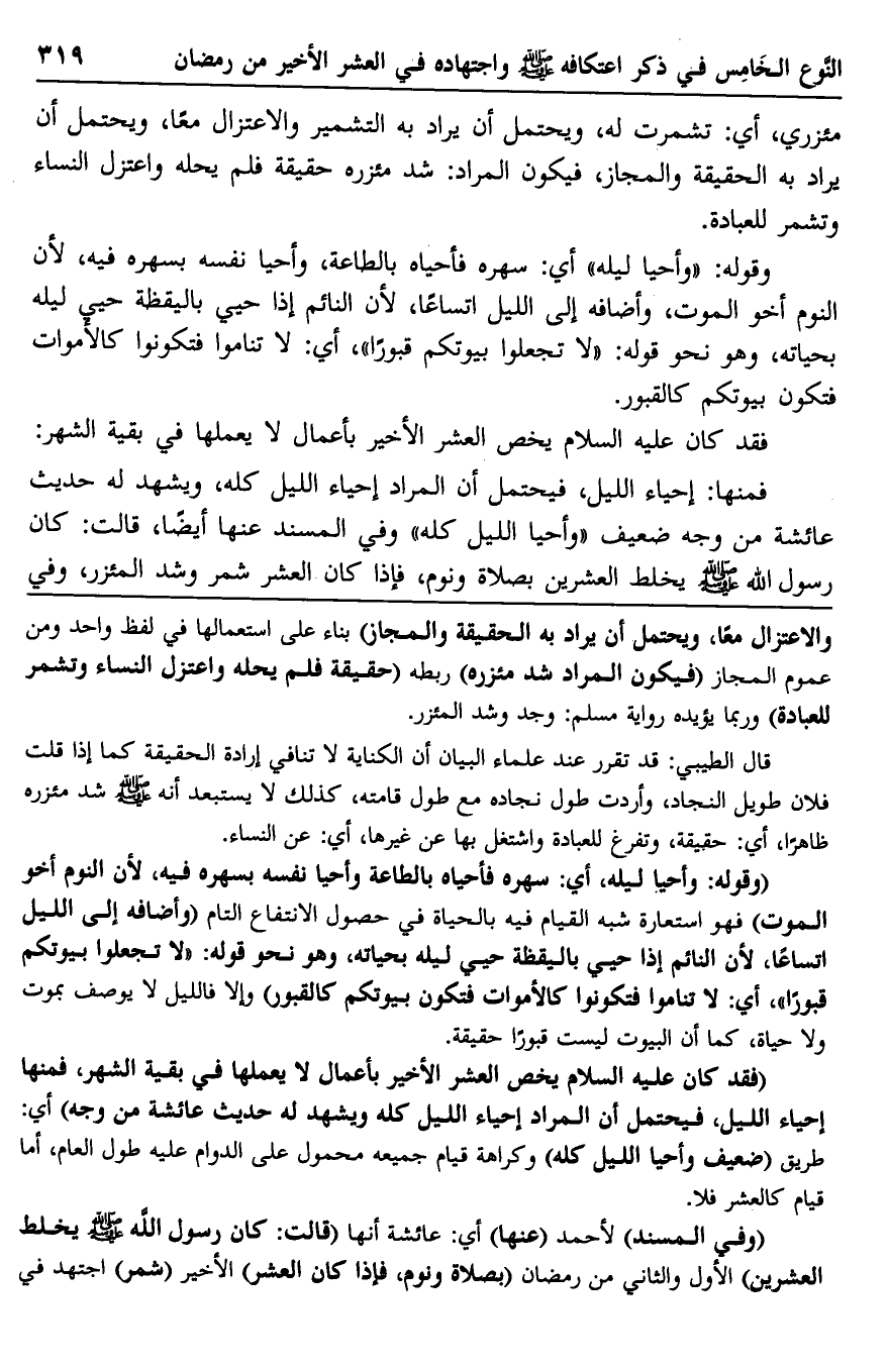 فقد كان عليه السلام يخص العشر الأخير بأعمال لا يعملها في بقية الشهر: فمنها: إحياء الليل، فيحتمل أن المراد إحياء الليل كله، ويشهد له حديث عائشة من وجه ضعيف "وأحيا الليل كله" وفي المسند عنها أيضًا، قالت: كان رسول الله -صلى الله عليه وسلم- يخلط العشرين بصلاة ونوم، فإذا كان العشر شمر وشد المئزر، وفي