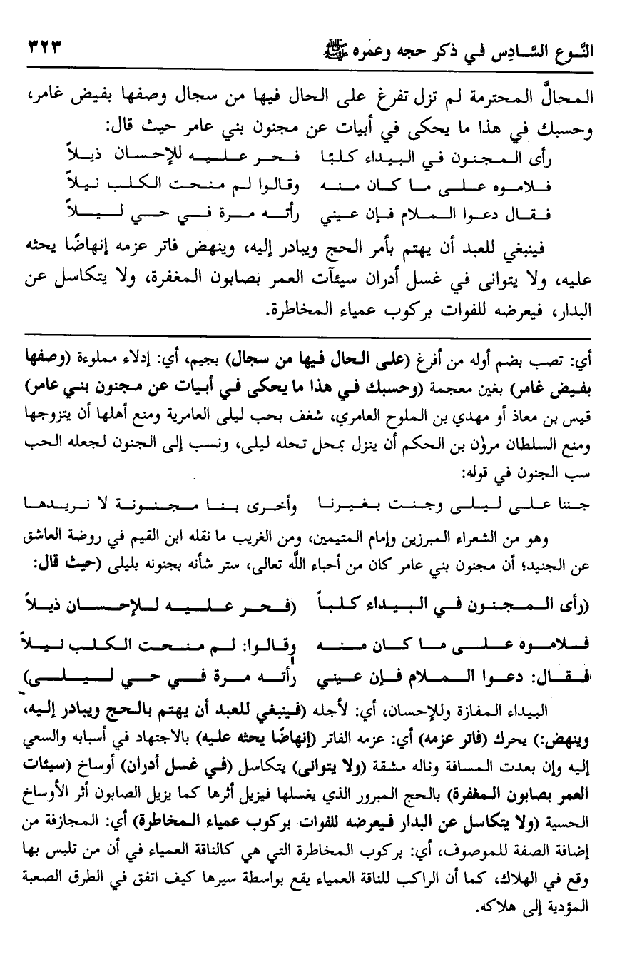 أي: تصب بضم أوله من أفرغ "على الحال فيها من سجال" بجيم، أي: إدلاء مملوءة "وصفها بفيض غامر" بغين معجمة وحسبك في هذا ما يحكى في أبيات عن مجنون بني عامر" قيس بن معاذ أو مهدي بن الملوح العامري، شغف بحب ليلى العامرية ومنع أهلها أن يتزوجها ومنع السلطان مروان بن الحكم أن ينزل بمحل تحله ليلى، ونسب إلى الجنون لجعله الحب سبب الجنون في قوله:
