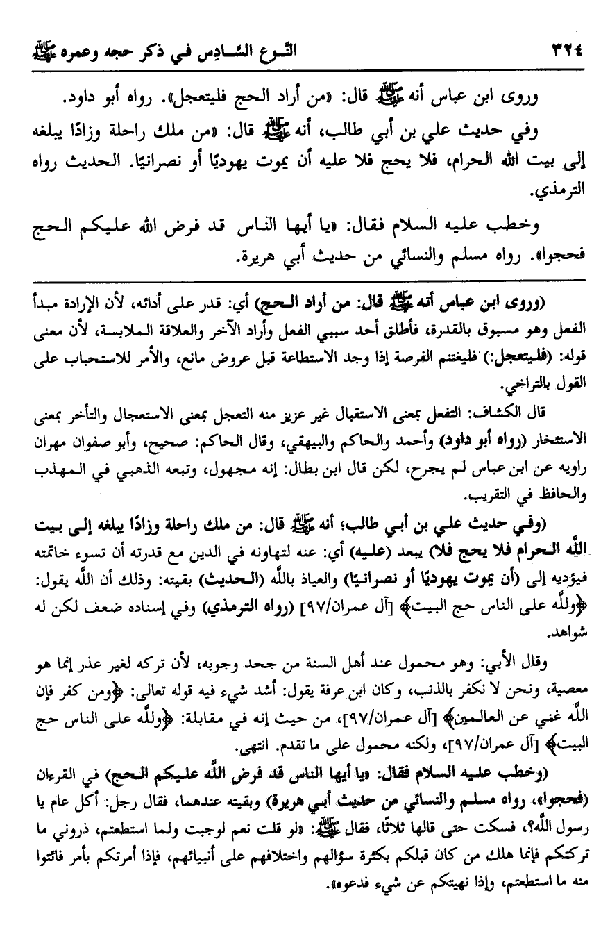 "وفي حديث علي بن أبي طالب؛ أنه -صلى الله عليه وسلم- قال: "من ملك راحلة وزادا يبلغه إلى بيت الله الحرام فلا يحج فلا" يبعد "عليه" أي: عنه لتهاونه في الدين مع قدرته أن تسوء خاتمته فيؤديه إلى "أن يموت يهوديا أو نصرانيا" والعياذ بالله "الحديث" بقيته: وذلك أن الله يقول: {وَلِلَّهِ عَلَى النَّاسِ حِجُّ الْبَيْتِ} [آل عمران: 97] "رواه الترمذي" وفي إسناده ضعف لكن له شواهد.