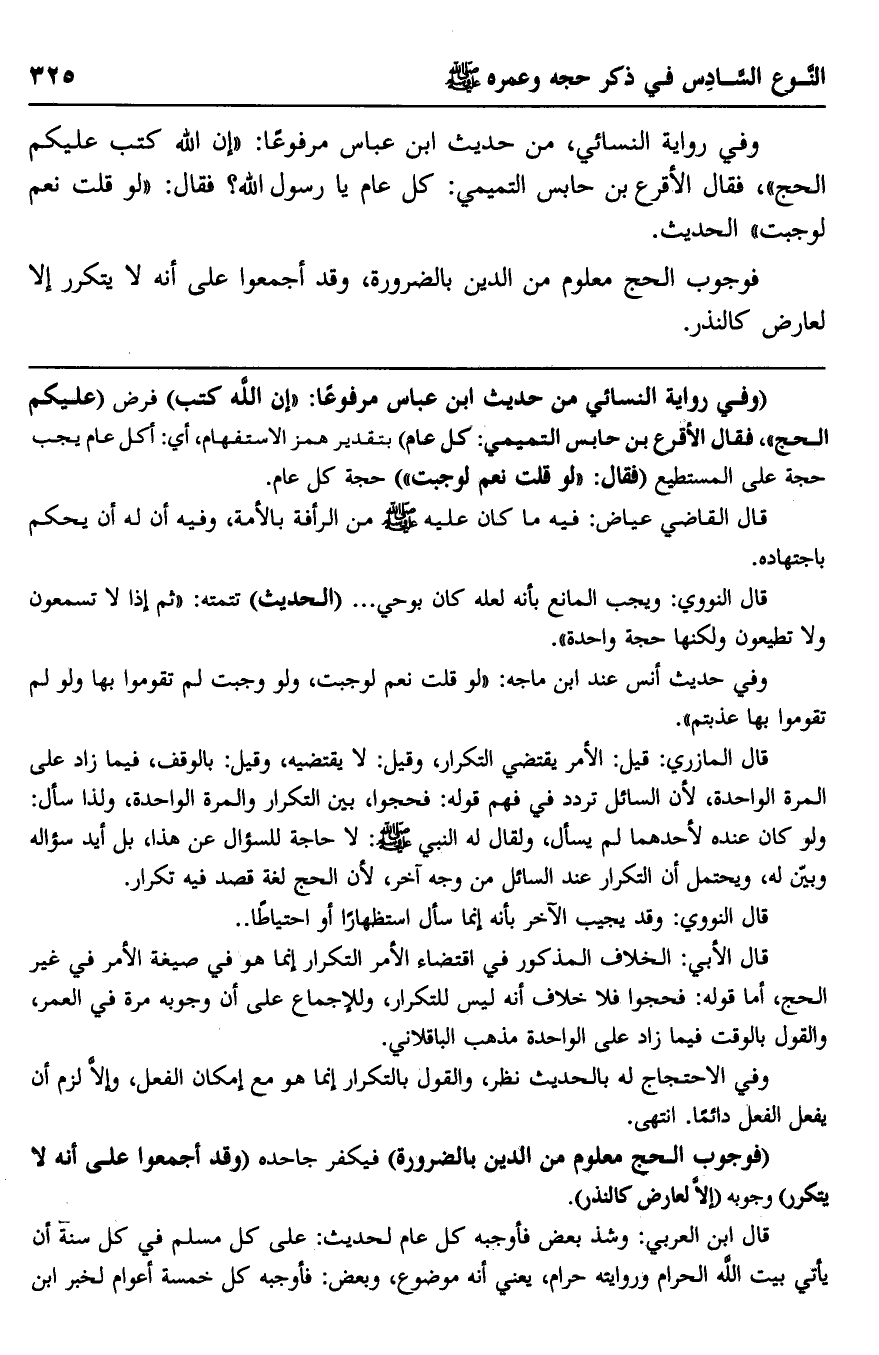 وفي رواية النسائي، من حديث ابن عباس مرفوعا: "إن الله كتب عليكم الحج"، فقال الأقرع بن حابس التميمي: كل عام يا رسول الله؟ فقال: "لو قلت نعم لوجبت" الحديث.