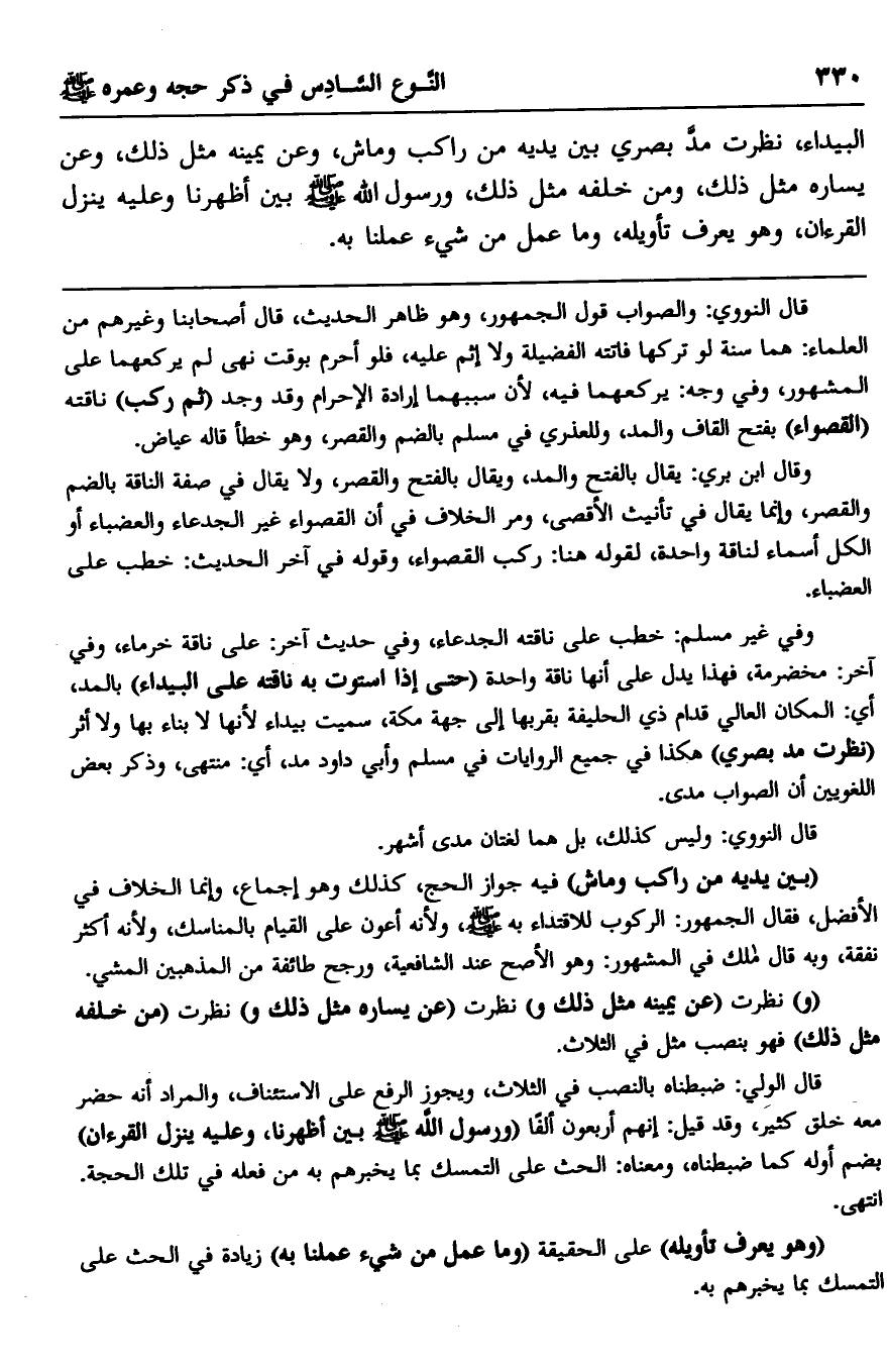 وقال ابن بري: يقال: بالفتح والمد، ويقال: بالفتح والقصر، ولا يقال في صفة الناقة: بالضم والقصر، وإنما يقال في تأنيث الأقصى، ومر الخلاف في أن القصواء غير الجدعاء والعضباء أو الكل أسماء لناقة واحدة، لقوله هنا: ركب القصواء، وقوله في آخر الحديث: خطب على العضباء.