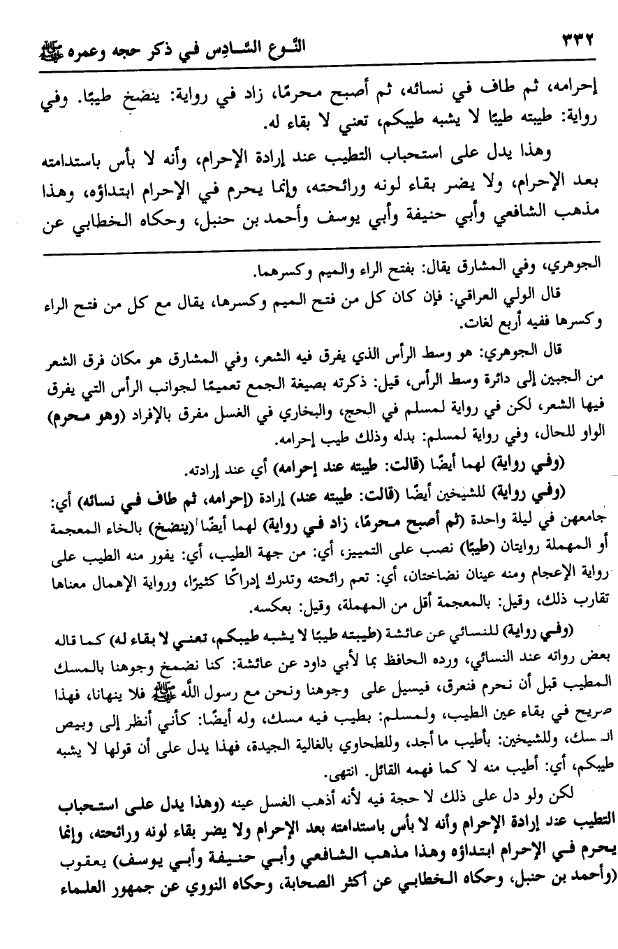 إحرامه، ثم طاف في نسائه، ثم أصبح محرما، زاد في رواية: ينضخ طيبا. وفي رواية: طيبته طيبا لا يشبه طيبكم، تعني لا بقاء له.