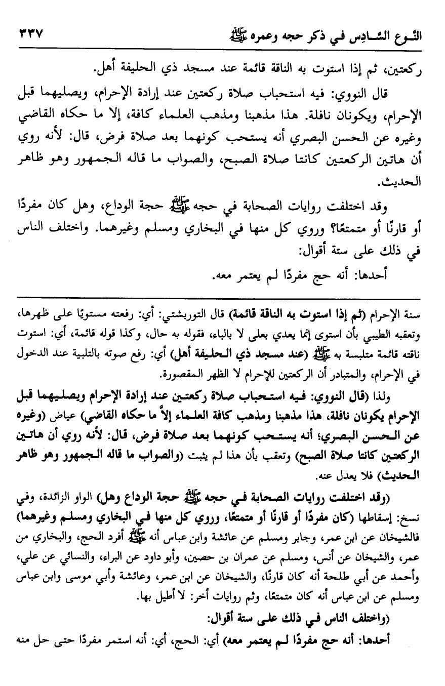 وقد اختلفت روايات الصحابة في حجه -صلى الله عليه وسلم- حجة الوداع، وهل كان مفردا أو قارنا أو متمتعا؟ وروي كل منها في البخاري ومسلم وغيرهما. واختلف الناس في ذلك على ستة أقوال: