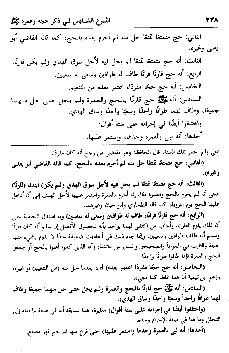 "السادس: أنه -صلى الله عليه وسلم- حج قارنا بالحج والعمرة ولم يحل حتى حل منهما جميعا وطاف لهما طوافا واحدا وسعيا واحد وساق الهدي".