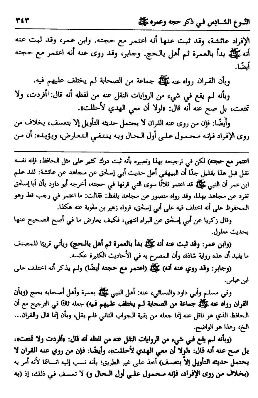 "وبأنه لم يقع في شيء من الروايات النقل عنه من لفظه أنه قال: "أفردت ولا تمتعت"، بل صح عنه أنه قال: "لولا أن معي الهدي لأحللت"، وأيضا: فإن من روى عنه القران لا يحتمل حديثه التأويل إلا بتعسف" أخذ على غير الطريق؛ بأنه نسب إليه اتساعا؛ لأنه أمر به "بخلاف من روى الإفراد، فإنه محمول على أول الحال و" لا تعسف في ذلك، إذ "به