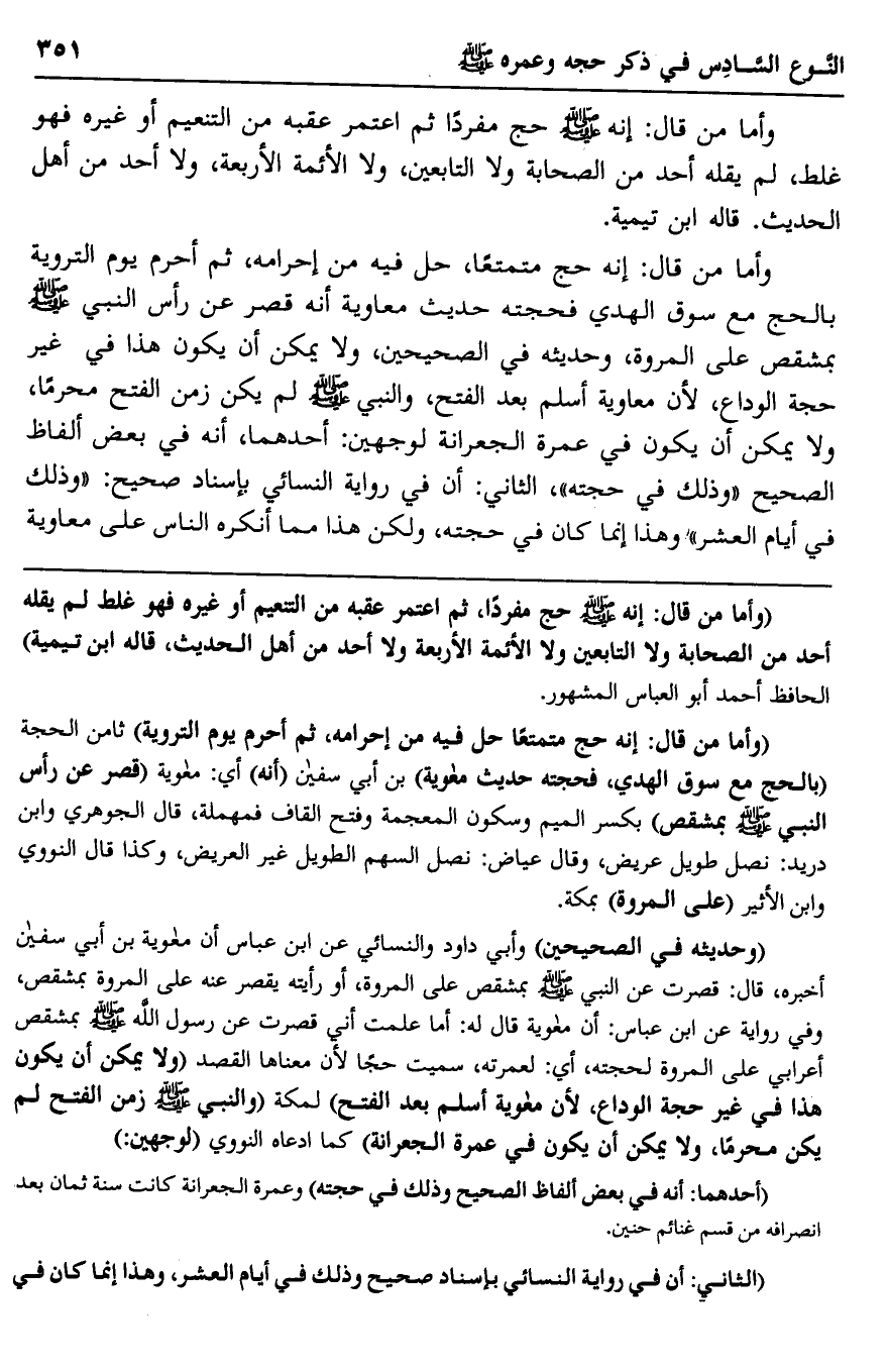 "وأما من قال: إنه -صلى الله عليه وسلم- حج مفردًا، ثم اعتمر عقبه من التنعيم أو غيره، فهو غلط لم يقله أحد من الصحابة ولا التابعين ولا الأئمة الأربعة ولا أحد من أهل الحديث، قاله ابن تيمية" الحافظ أحمد أبو العباس المشهور.