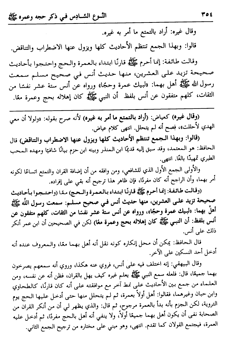وقالت طائفة: إنما أحرم -صلى الله عليه وسلم- قارنا ابتداء بالعمرة والحج، واحتجوا بأحاديث صحيحة تزيد على العشرين، منها حديث أنس في صحيح مسلم سمعت رسول الله -صلى الله عليه وسلم- أهل بهما: "لبيك عمرة وحجا" ورواه عن أنس ستة عشر نفسا من الثقات، كلهم متفقون عن أنس بلفظ أن النبي -صلى الله عليه وسلم- كان إهلاله بحج وعمرة معا.