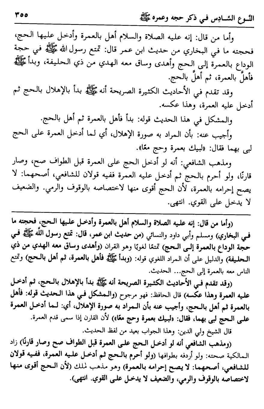 "وقد تقدم في الأحاديث الكثيرة الصريحة أنه -صلى الله عليه وسلم- بدأ بالإهلال بالحج، ثم أدخل عليه العمرة وهذا عكسه" قال الحافظ: فهو مرجوح "والمشكل في هذا الحديث قوله: فأهل بالعمرة ثم أهل بالحج، وأجيب عنه بأن المراد به صورة الإهلال، أي: لما أدخل العمرة على الحج لبى بهما، فقال: "لبيك بعمرة وحج معا" لأن القارن إذا سمى قدم العمرة.