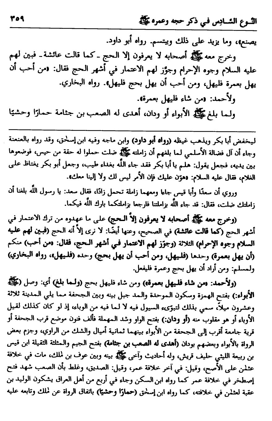 وخرج معه -صلى الله عليه وسلم- أصحابه لا يعرفون إلا الحج -كما قالت عائشة- فبين لهم عليه السلام وجوه الإحرام وجوز لهم الاعتمار في أشهر الحج فقال: "من أحب أن يهل بعمرة فليهل، ومن أحب أن يهل بحج فليهل". رواه البخاري.