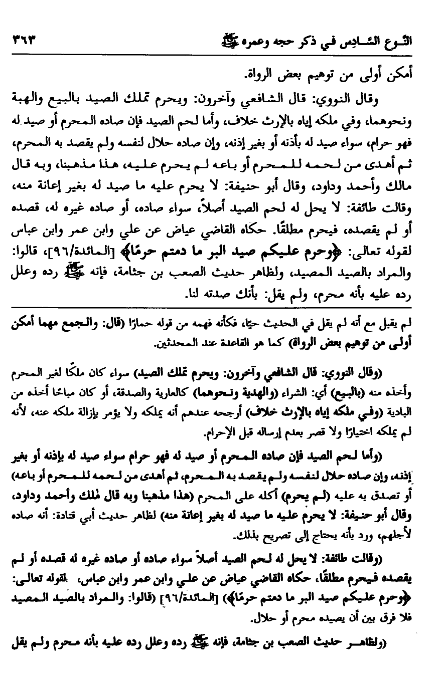 وقال النووي: قال الشافعي وآخرون: ويحرم تملك الصيد بالبيع والهبة ونحوهما، وفي ملكه إياه بالإرث خلاف، وأما لحم الصيد فإن صاده المحرم أو صيد له فهو حرام، سواء صيد له بأذنه أو بغير إذنه، وإن صاده حلال لنفسه ولم يقصد به المحرم، ثم أهدى من لحمه للمحرم أو باعه لم يحرم عليه، هذا مذهبنا، وبه قال مالك وأحمد وداود، وقال أبو حنيفة: لا يحرم عليه ما صيد له بغير إعانة منه، وقالت طائفة: لا يحل له لحم الصيد أصلا، سواء صاده أو صاده غيره له، قصده أو لم يقصده، فيحرم مطلقا. حكاه القاضي عياض عن علي وابن عمر وابن عباس لقوله تعالى: {وَحُرِّمَ عَلَيْكُمْ صَيْدُ الْبَرِّ مَا دُمْتُمْ حُرُمًا} [المائدة: 96] ، قالوا: والمراد بالصيد المصيد، ولظاهر حديث الصعب بن جثامة، فإنه -صلى الله عليه وسلم- رده وعلل رده عليه بأنه محرم، ولم يقل: بأنك صدته لنا.