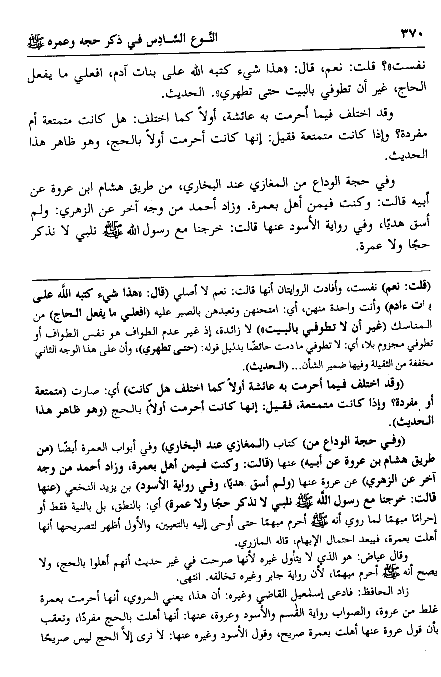 "نفست"؟ قلت: نعم، قال: "هذا شيء كتبه الله علي بنات آدم، افعلي ما يفعل الحاج، غير أن تطوفي بالبيت حتى تطهري". الحديث.