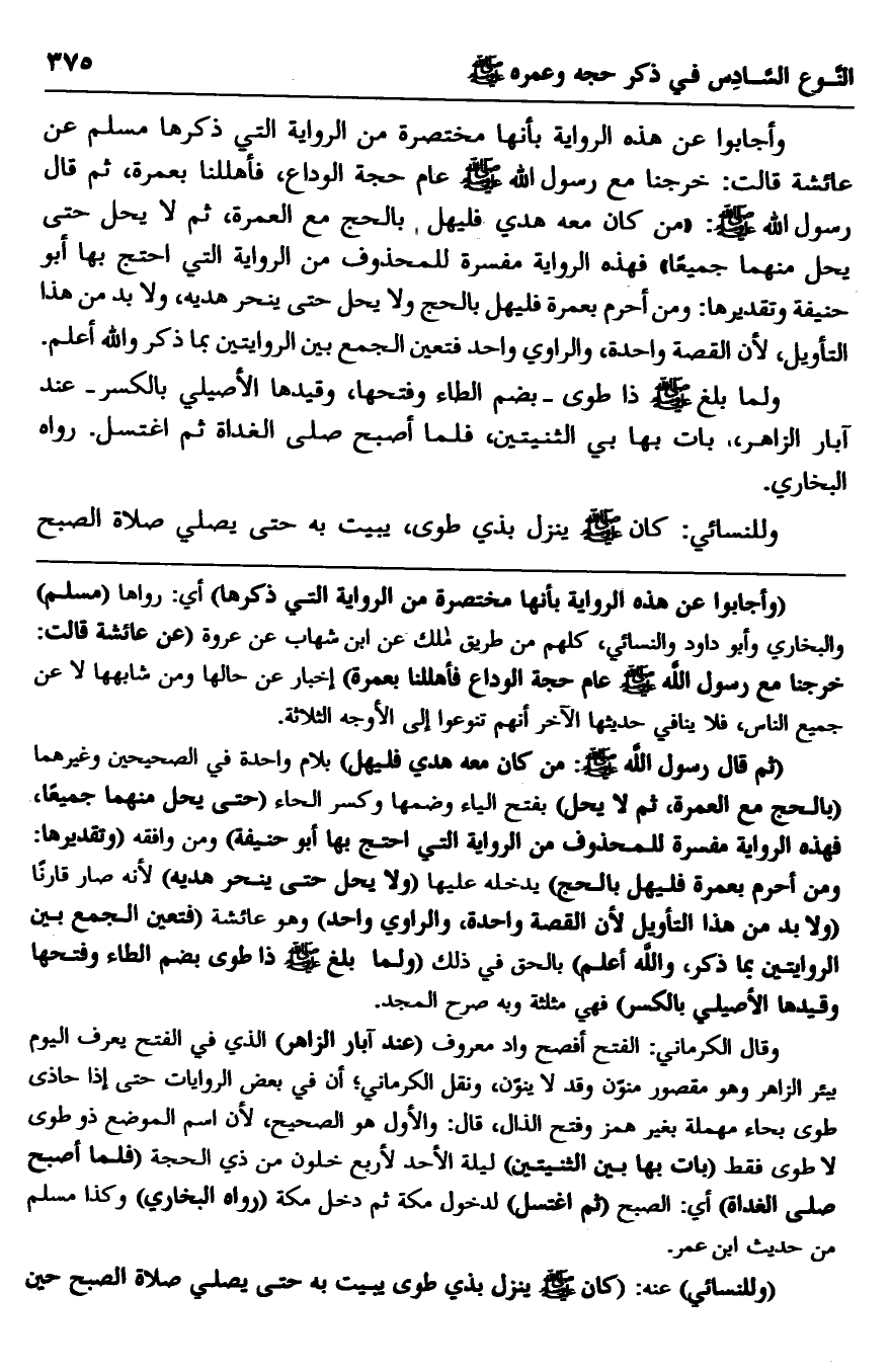 "ثم قال رسول الله -صلى الله عليه وسلم: "من كان معه هدي فليهل" بلام واحدة في الصحيحين وغيرهما "بالحج مع العمرة، ثم لا يحل" بفتح الياء وضمها وكسر الحاء "حتى يحل منهما جميعا، فهذه الرواية مفسرة للمحذوف من الرواية التي احتج بها أبو حنيفة" ومن وافقه "وتقديرها: ومن أحرم بعمرة فليهل بالحج" يدخله عيها "ولا يحل حتى ينحر هديه" لأنه صار قارنًا "ولا بد من هذا التأويل؛ لأن القصة واحدة، والراوي واحد" وهو عائشة "فتعين الجمع بين الروايتين بما ذكر، والله أعلم" بالحق في ذلك "ولما بلغ -صلى الله عليه وسلم- ذا طوى بضم الطاء وفتحها وقيدها الأصيلي بالكسر" فهي مثلة وبه صرح المجد.