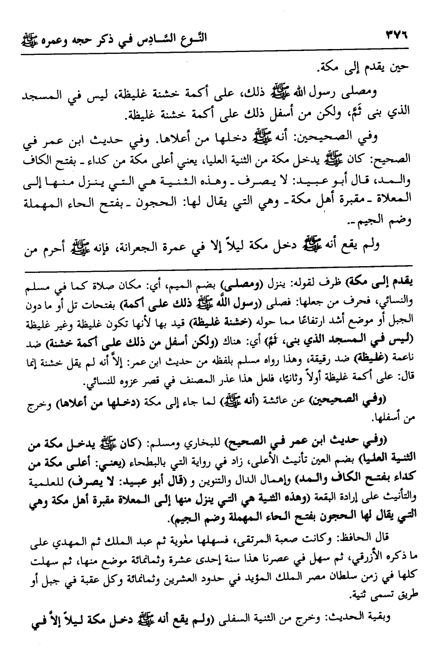 وفي الصحيحين: أنه -صلى الله عليه وسلم- دخلها من أعلاها. وفي حديث ابن عمر في الصحيح: كان -صلى الله عليه وسلم- يدخل مكة من الثنية العليا، يعني أعلى مكة من كداء -بفتح الكاف والمد، قال أبو عبيد: لا يصرف- وهذه الثنية هي التي ينزل منها إلى المعلاة -مقبرة أهل مكة- وهي التي يقال لها: الحجون -بفتح الحاء المهملة وضم الجيم ...