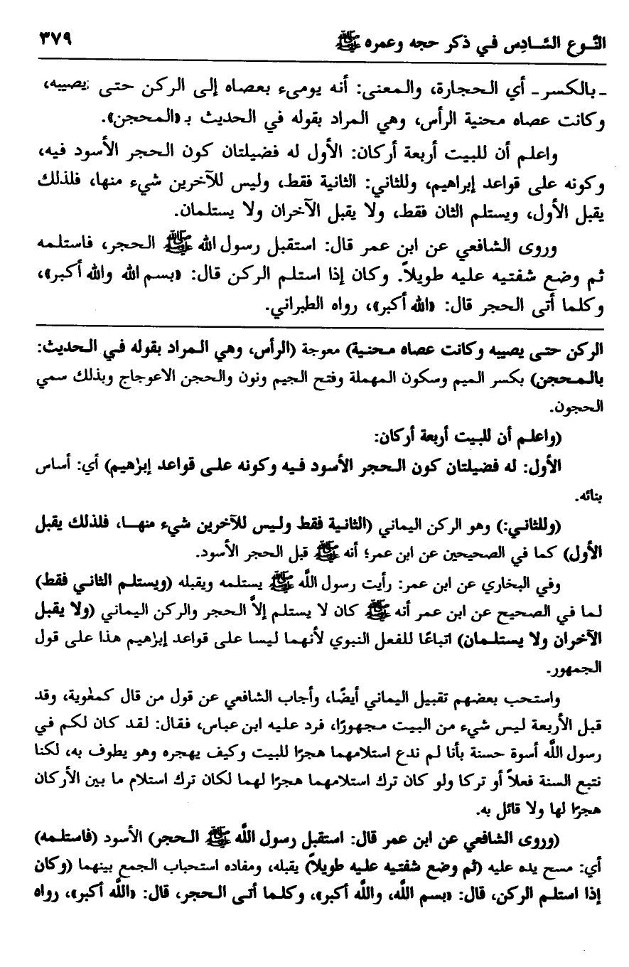 "وروى الشافعي عن ابن عمر قال: استقبل رسول الله -صلى الله عليه وسلم- الحجر" الأسود "فاستلمه" أي: مسح يده عليه "ثم وضع شفتيه عليه طويلًا" يقبله، ومفاده استحباب الجمع بينهما "وكان إذا استلم الركن، قال: "بسم الله، الله أكبر"، وكلما أتى الحجر، قال: "الله أكبر"، رواه