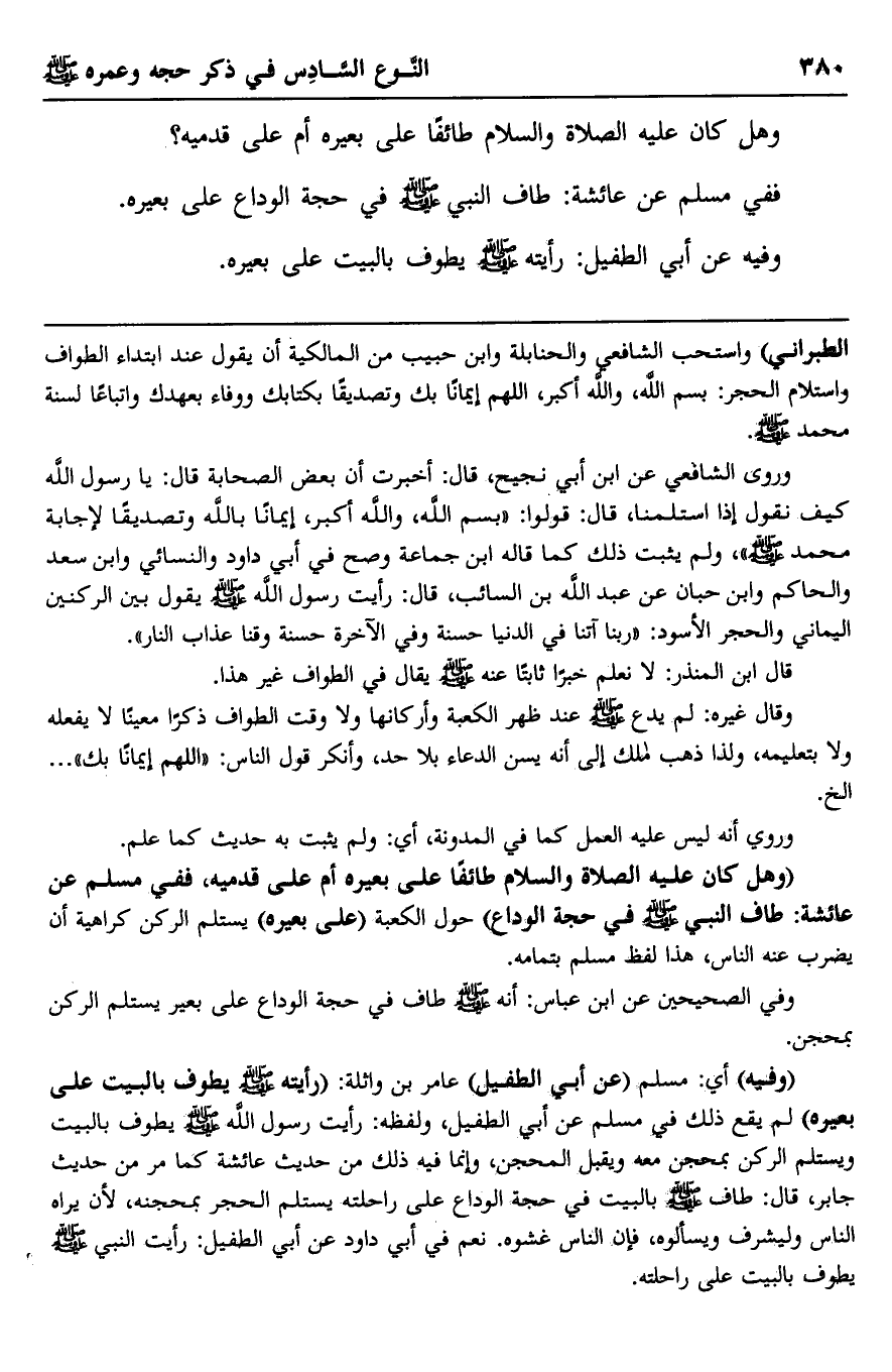 "وهل كان عليه الصلاة والسلام طائفا على بعيره أم على قدميه، ففي مسلم عن عائشة: طاف النبي -صلى الله عليه وسلم- في حجة الوداع" حول الكعبة "على بعيره" يستلم الركن كراهية أن يضرب عنه الناس، هذا لفظ مسلم بتمامه.