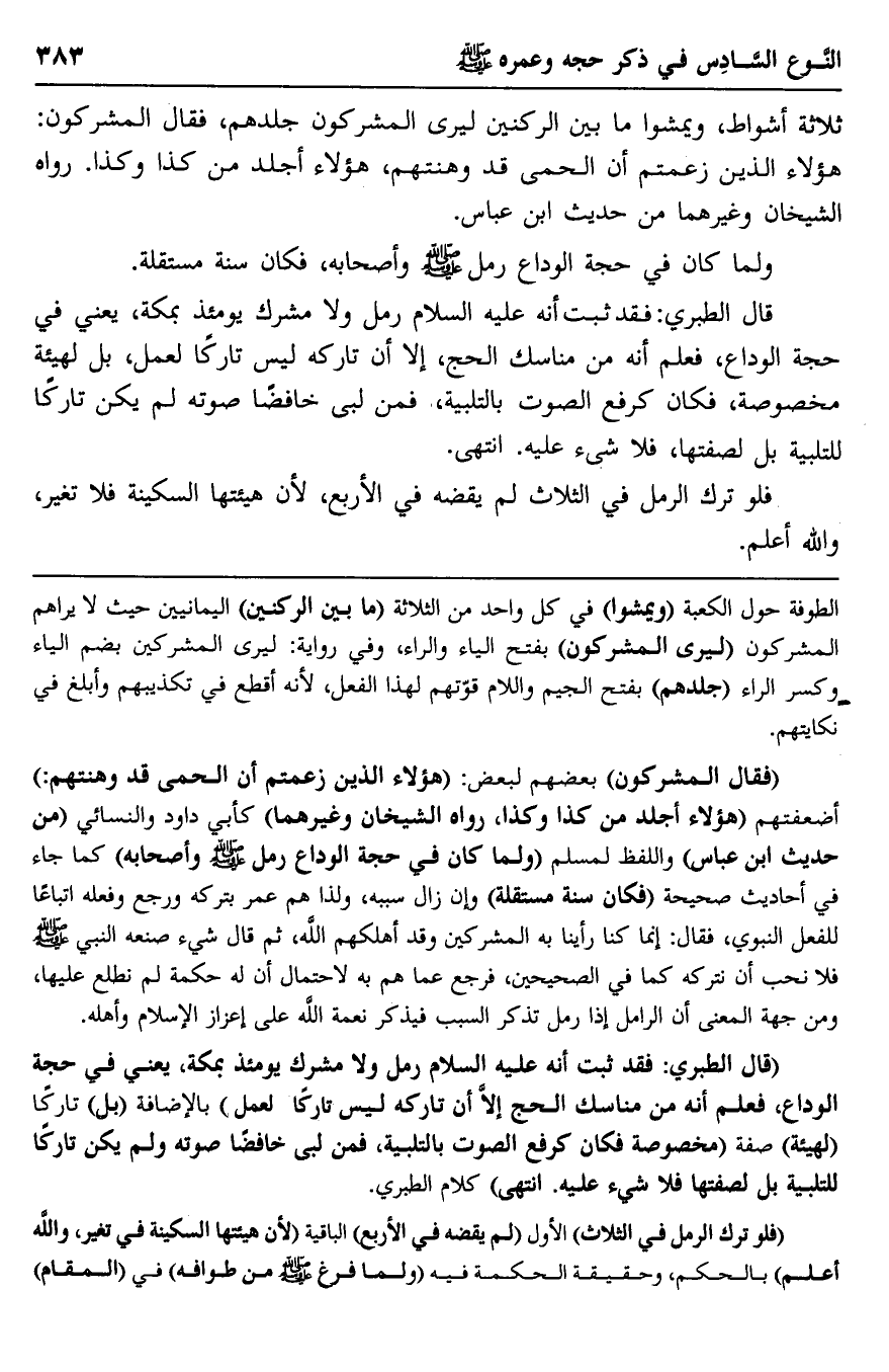 قال الطبري: فقد ثبت أنه عليه السلام رمل ولا مشرك يومئذ بمكة، يعني في حجة الوداع، فعلم أنه من مناسك الحج، إلا أن تاركه ليس تاركا لعمل، بل لهيئة مخصوصة، فكان كرفع الصوت بالتلبية، فمن لبى خافضا صوته لم يكن تاركا للتلبية بل لصفتها، فلا عليه. انتهى.