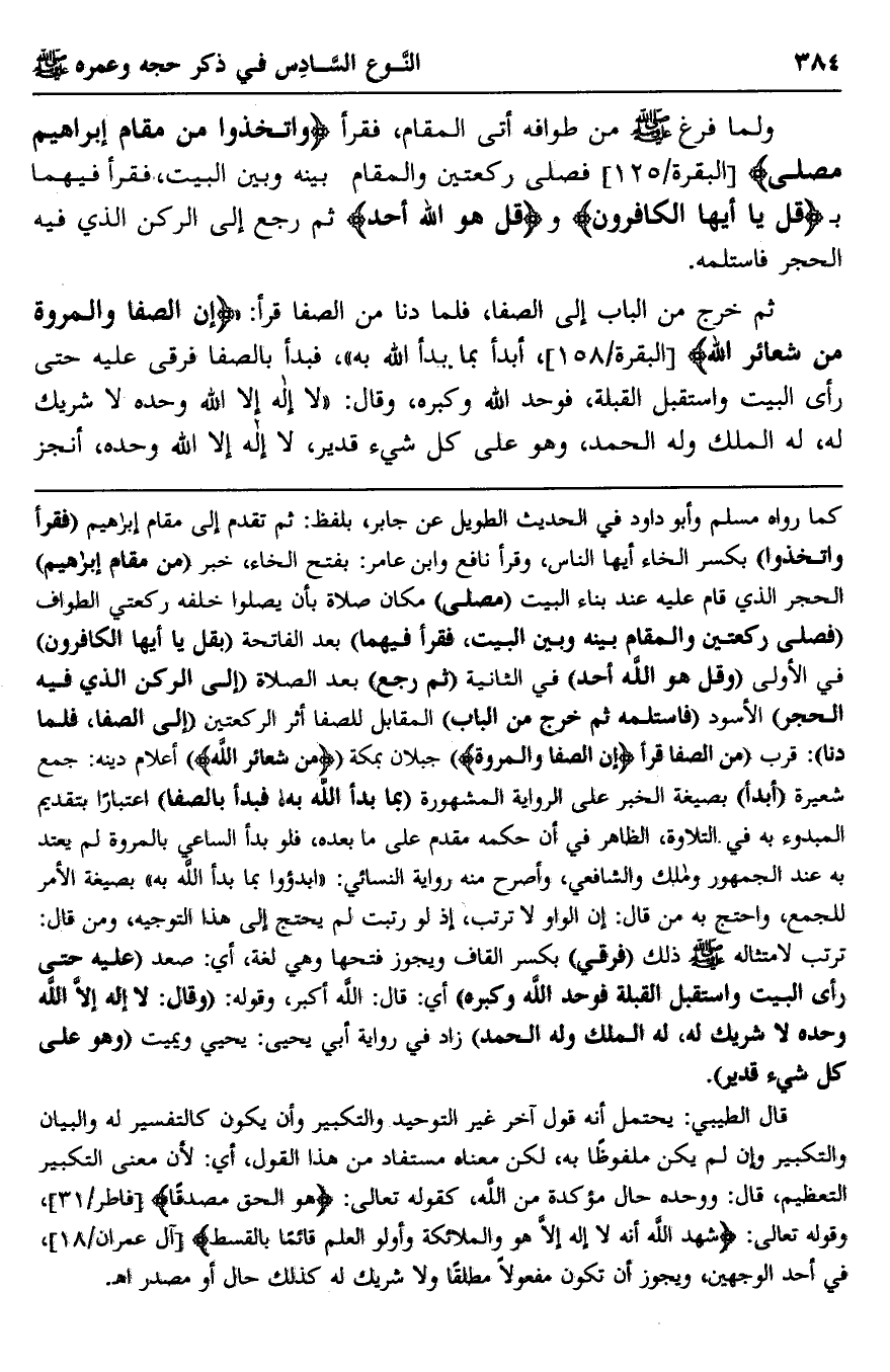 ثم خرج من الباب إلى الصفا، فلما دنا من الصفا قرأ: {إِنَّ الصَّفَا وَالْمَرْوَةَ مِنْ شَعَائِرِ اللَّهِ} [البقرة: 158] ، أبدأ بما بدأ الله به"، فبدأ بالصفا فرقى عليه حتى رأى البيت واستقبل القبلة، فوحد الله وكبره، وقال: "لا إله إلا الله وحده لا شريك له، له الملك وله الحمد، وهو على كل شيء قدير، لا إله إلا الله وحده، أنجز