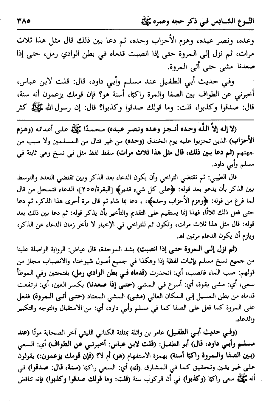 وفي حديث أبي الطفيل عند مسلم وأبي داود، قال: قلت لابن عباس، أخبرني عن الطواف بين الصفا والمروة راكبا، أسنة هو؟ فإن قومك يزعمون أنه سنة، قال: صدقوا وكذبوا، قلت: وما قولك: صدقوا وكذبوا؟ قال: إن رسول الله -صلى الله عليه وسلم- كثر